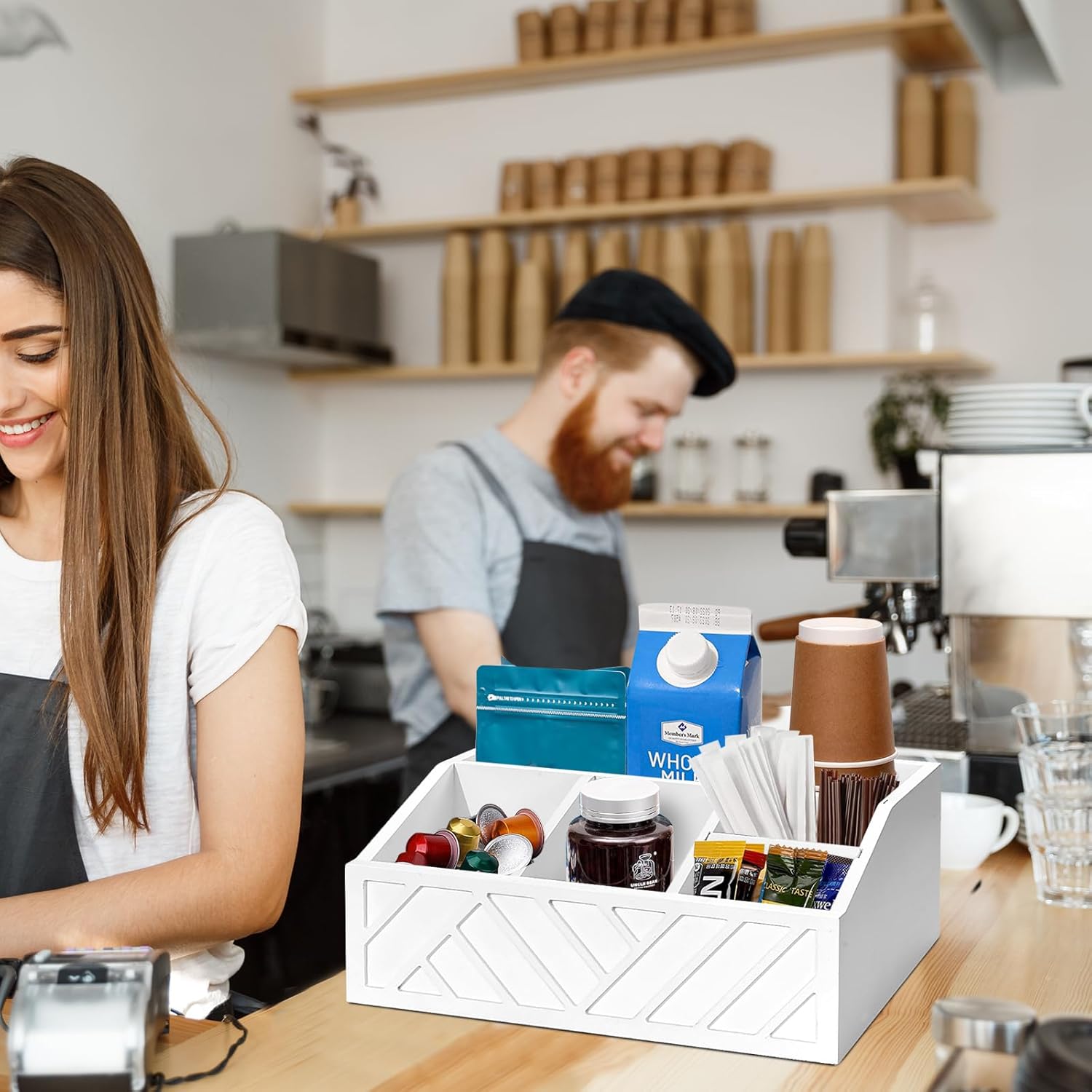 - 【Unlock Unlimited Possibilities by Bar Organizer】The white carved coffee condiment organizer offers endless possibilities, not only for storing your coffee bar accessories, but even for storing your utensils in the kitchen. Whether used for home kitchen counters, office lounge areas, restaurants, hotel lobbies, offices or even outdoor events, this rustic k cup coffee syrup organizer effortlessly elevates the atmosphere and adds a touch of elegance to any space.