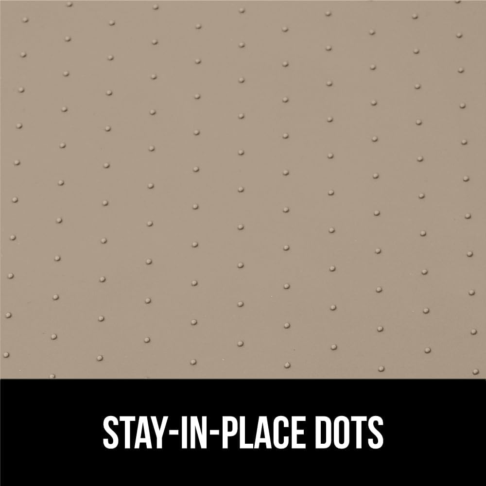 - STAYS IN PLACE: designed to lay flat and grip your cabinets, mat stays in place with daily use taking items in and out; raised silicone dots on the topside help prevent items from slipping and sliding around the mat