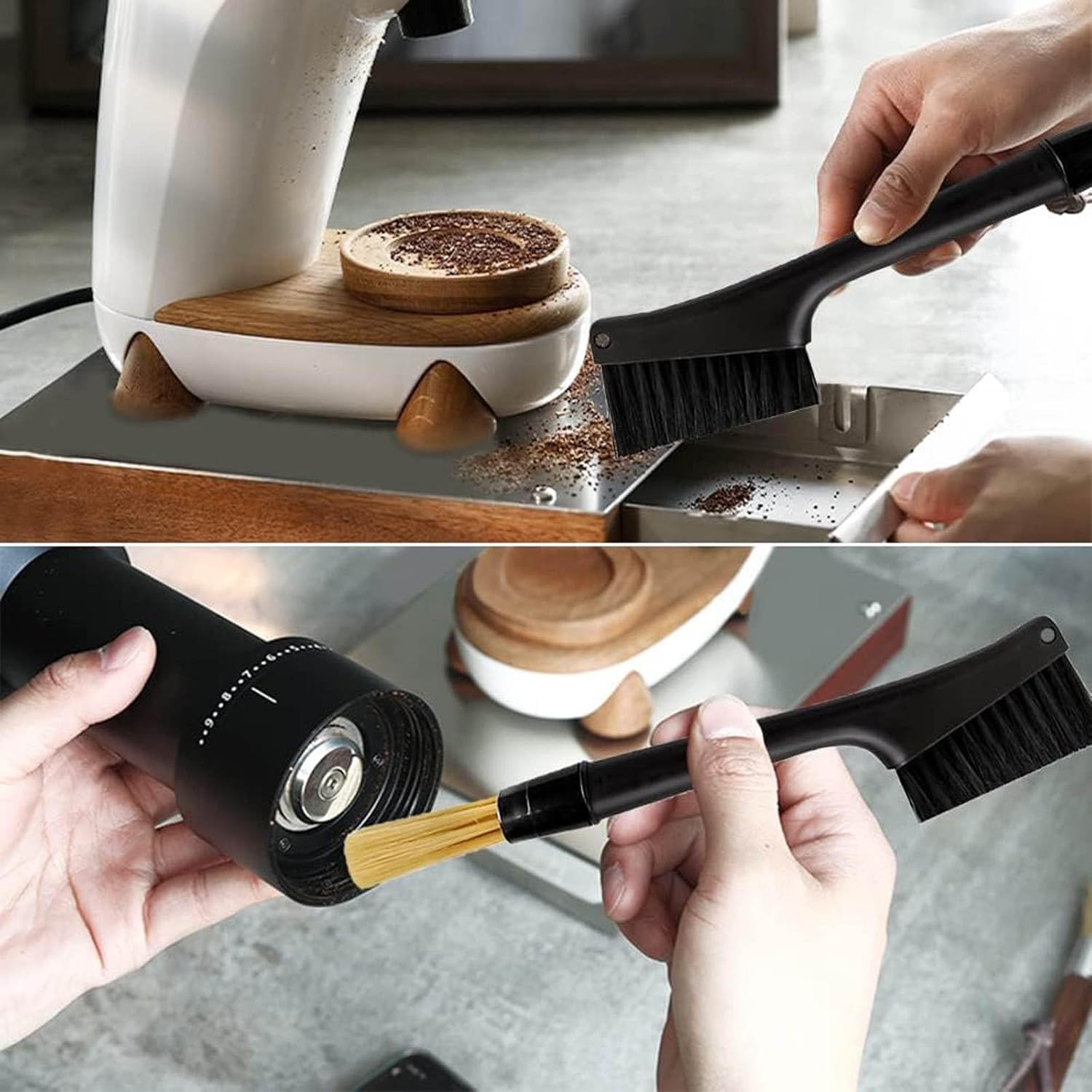 - ☕ Dual-Purpose Coffee Brush - The flat head can be used to clean coffee grinders and sweep the coffee bar tabletop. The round head is a soft grinder brush, it can be used to clean coffee grounds, coffee grinder machine, espresso group head, and portafilter.
