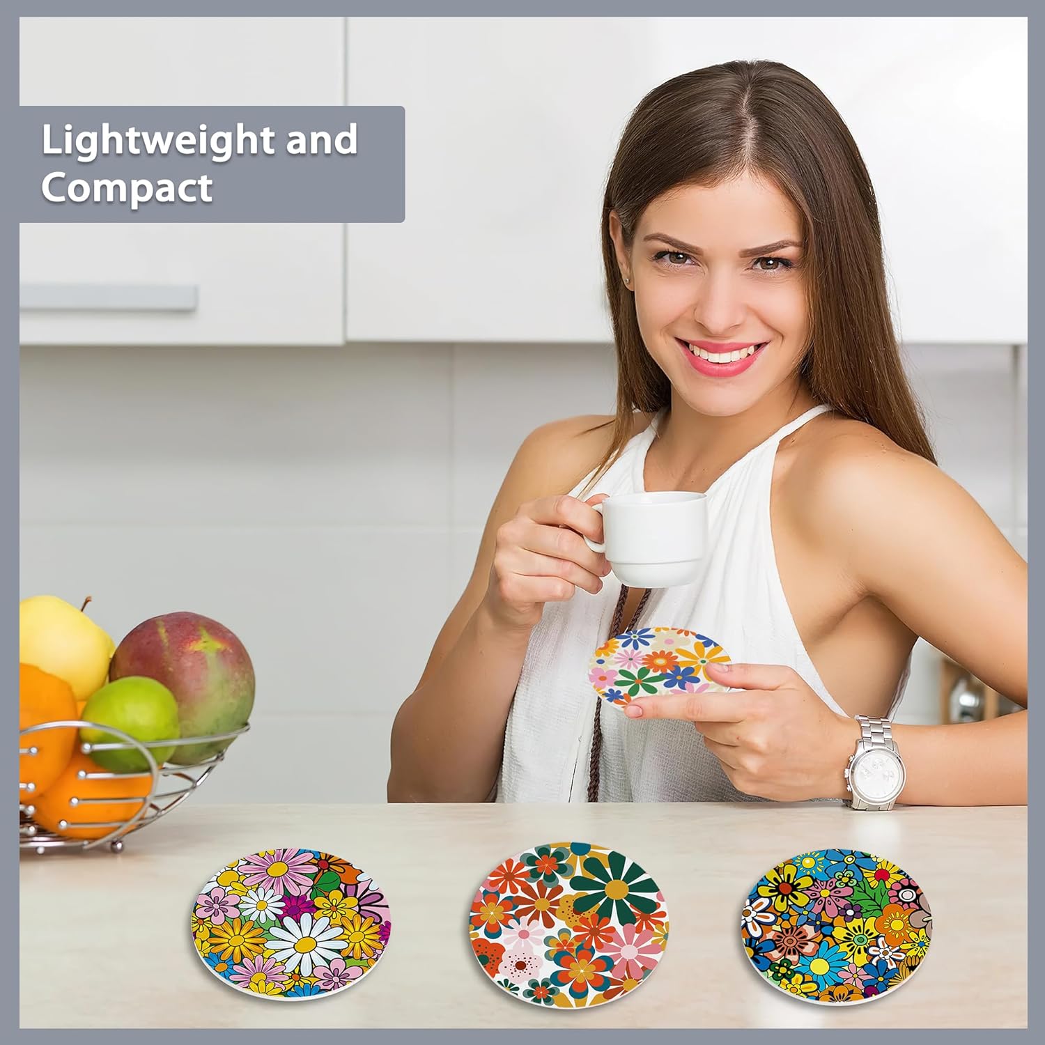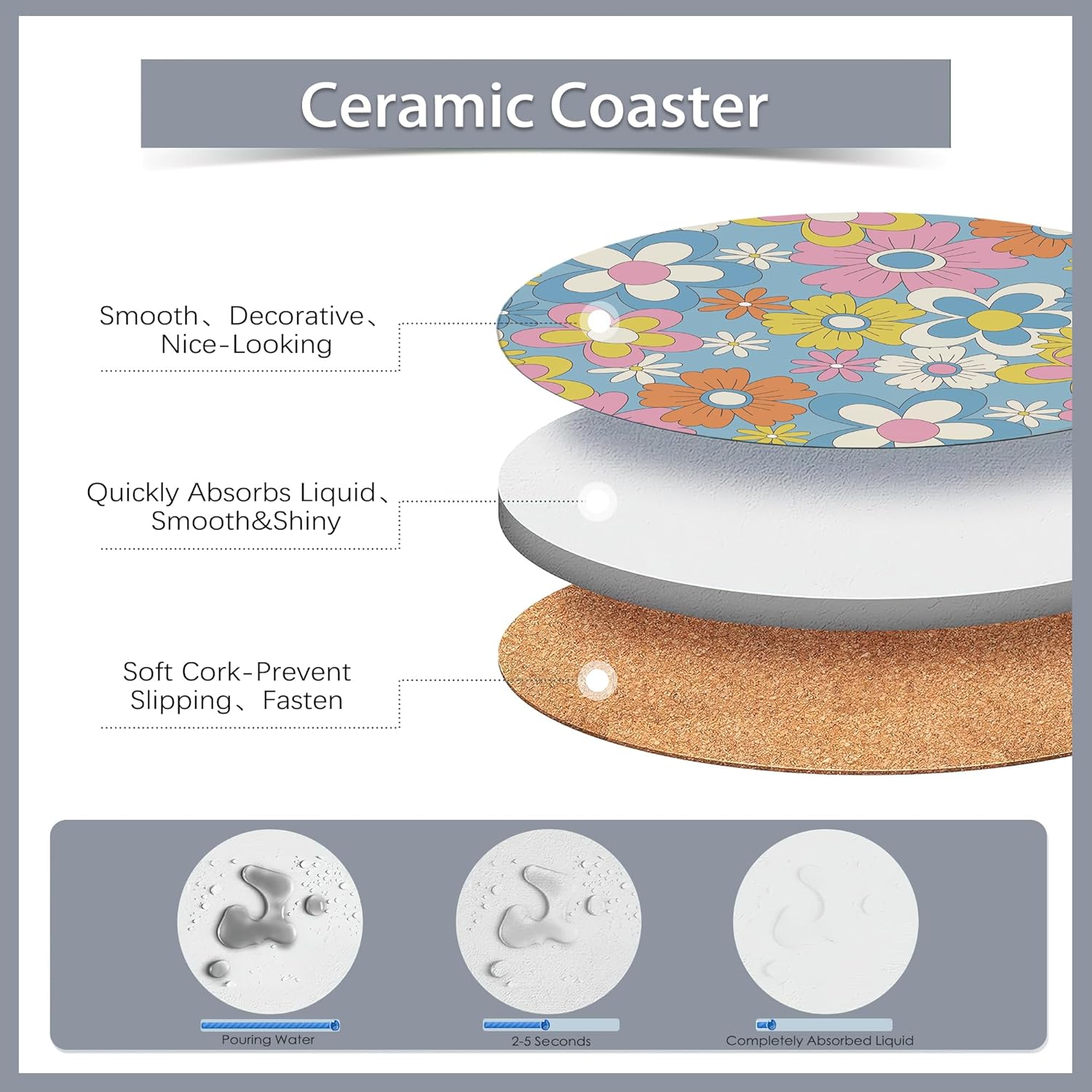 6 Pcs Coasters for Drinks with Holder,Retro Colorful Daisy Flowers 70s Hippie Floral Absorbent Coaster with Cork Backing,Great Gift for Housewarming,Room Decor,Bar,Holiday Party