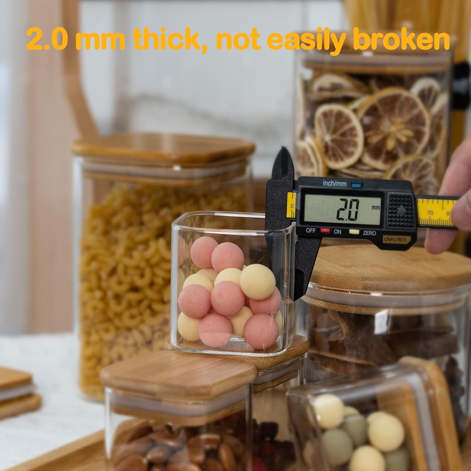 - [Thickened Glass jars] - Our glass storage jars are made of food grade borosilicate glass, BPA-free, hard and safe. Note: Our glass jars can be washed in the dishwasher or put in the refrigerator. We recommend removing the wooden lid before using it in the dishwasher and washing it by hand.