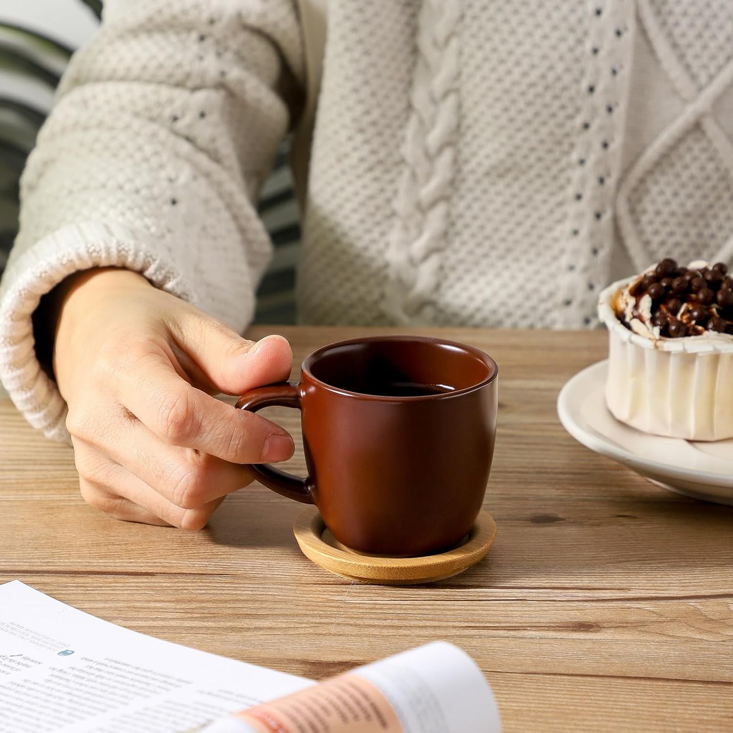Hasense Stackable Porcelain Mini Espresso Cups and Saucers Set of 6, 4 OZ Ceramic Small Demitasse Espresso Shots Cups with Lids for Nespresso Lungo, Latte, Cafe Mocha and Tea, Brown
