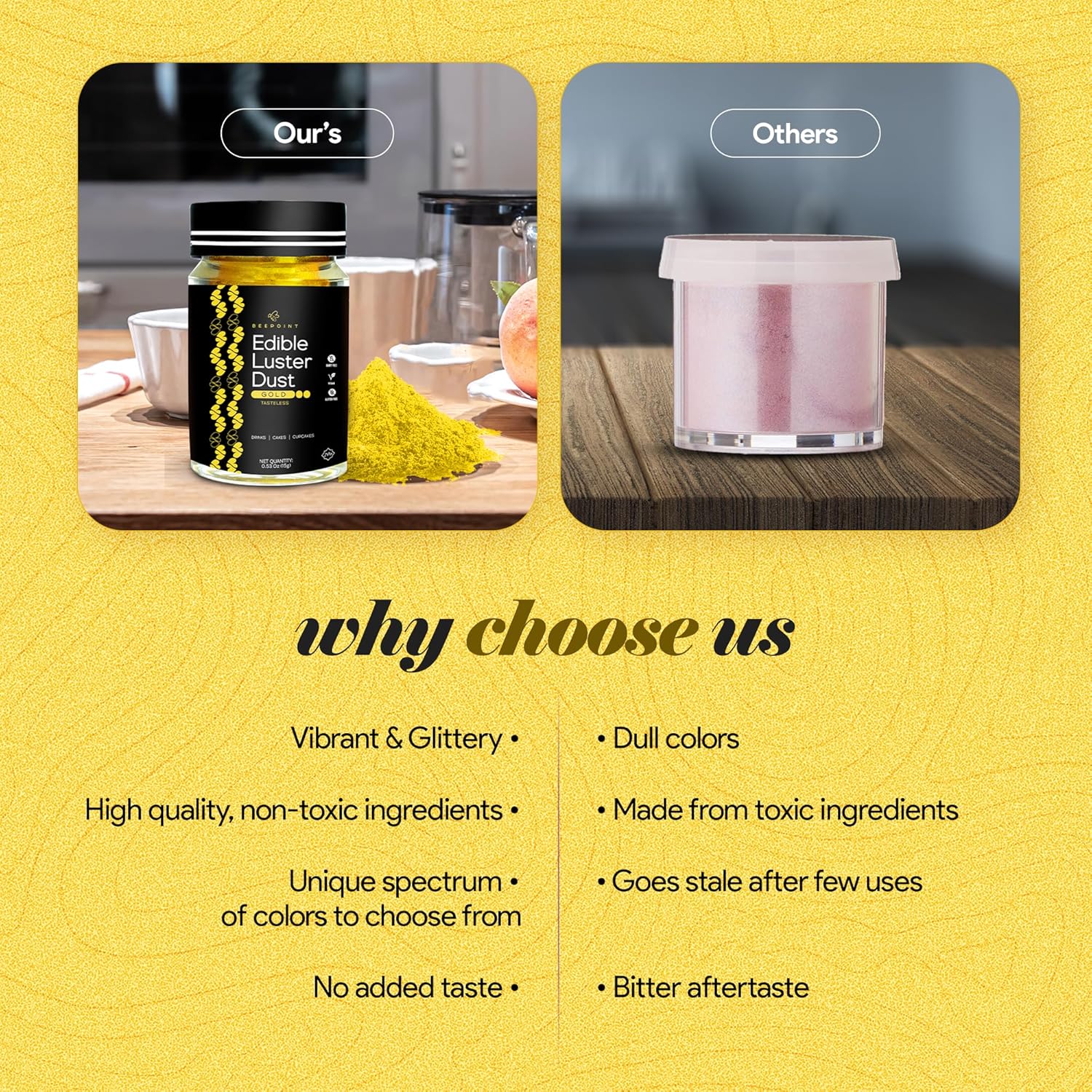 - Elevate Your Look with Precision: Experience the allure of our enhanced formula edible luster dust powder. With its refined texture, a mere dab achieves your desired effect. Each bottle contains 15g of transformative brilliance