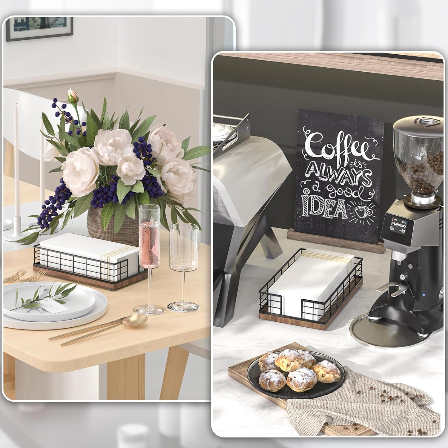 Wican Guest Towel Holder Tray for Bathroom, Oak and Iron Napkins Holder for Powder Room Dinning Table Wooden Basket for Disposable Paper Hand Towels Black & Walnut