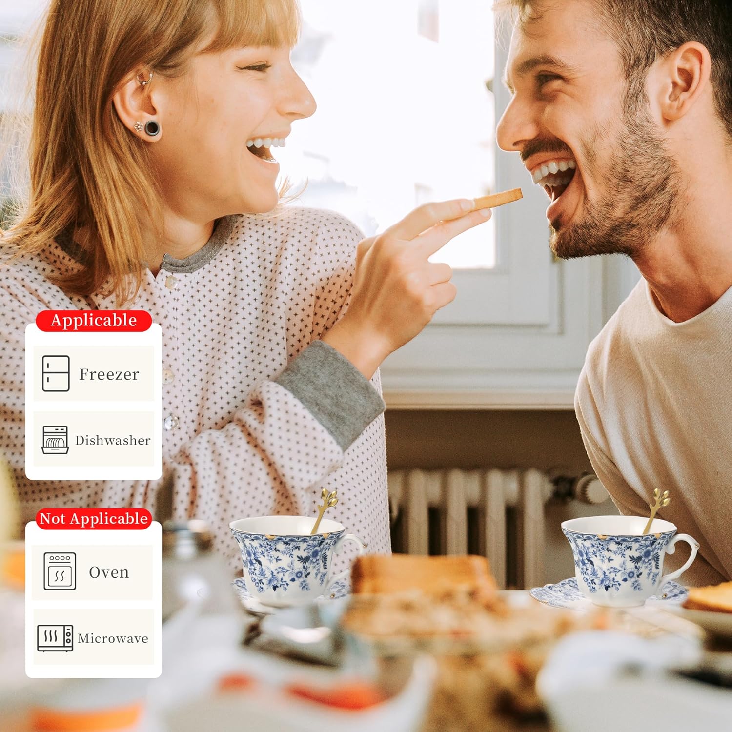 - 8.5 Ounce Bone China Porcelain Tea Cup and Saucer, Assorted colors, Floral Pattern, Set of 6