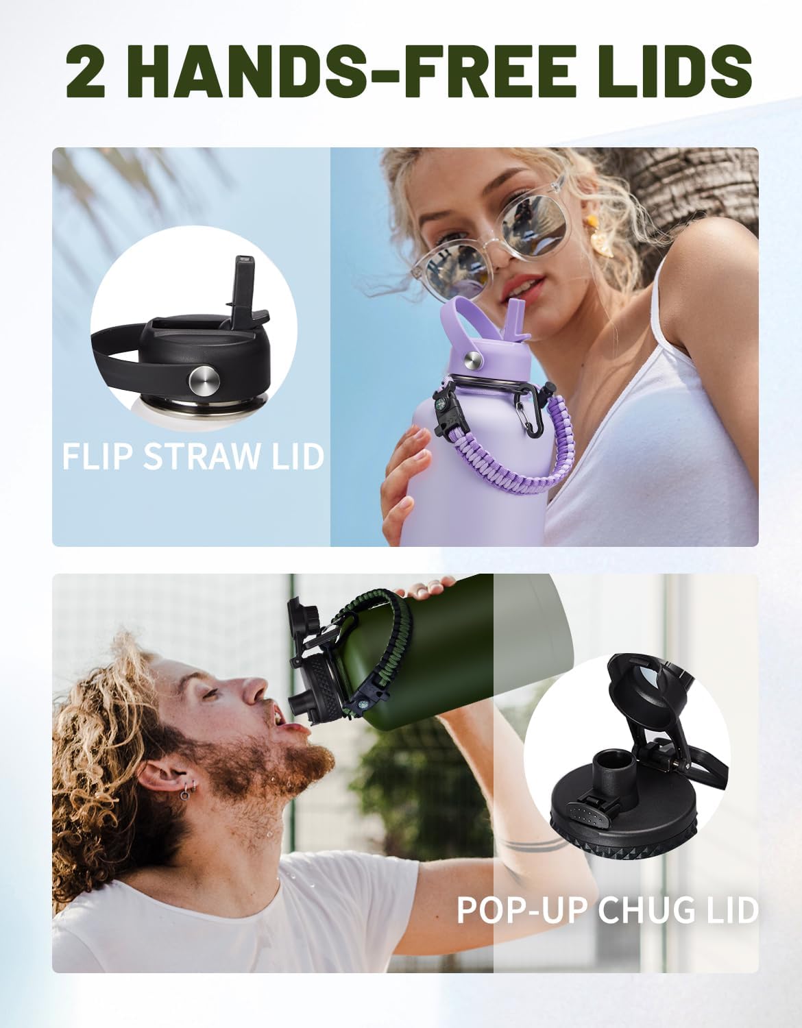 - 2 LID OPTIONS (Auto-spout & Straw): two different lids are complete LEAK PROOF & design for easy drink. The pops-up lid for easy drinking and seals shut for no leaks when you're on the go. The straw lid makes it easy to enjoy spill-proof sips, and package come with a alternative straw & a straw brush for easy cleaning