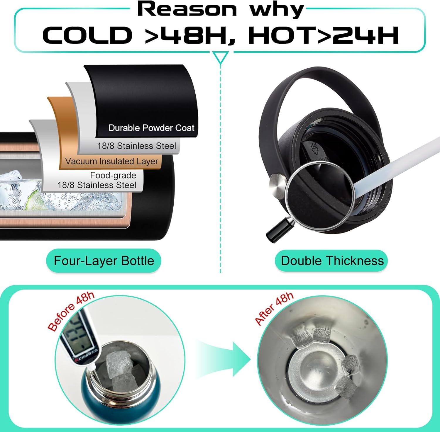 - QUALITY VACUUM INSULATION: Metal water bottle featuring double-wall & food-grade 18/8 stainless steel with superior insulation & anti-condensation, keeping your beverages stay ICE COLD for 48-Hours & HOT for 24-Hours for a fresh taste. In addition, the outer layer with non-slip powder coating ensures drinking bottles won't sweat & that keeps it from slipping
