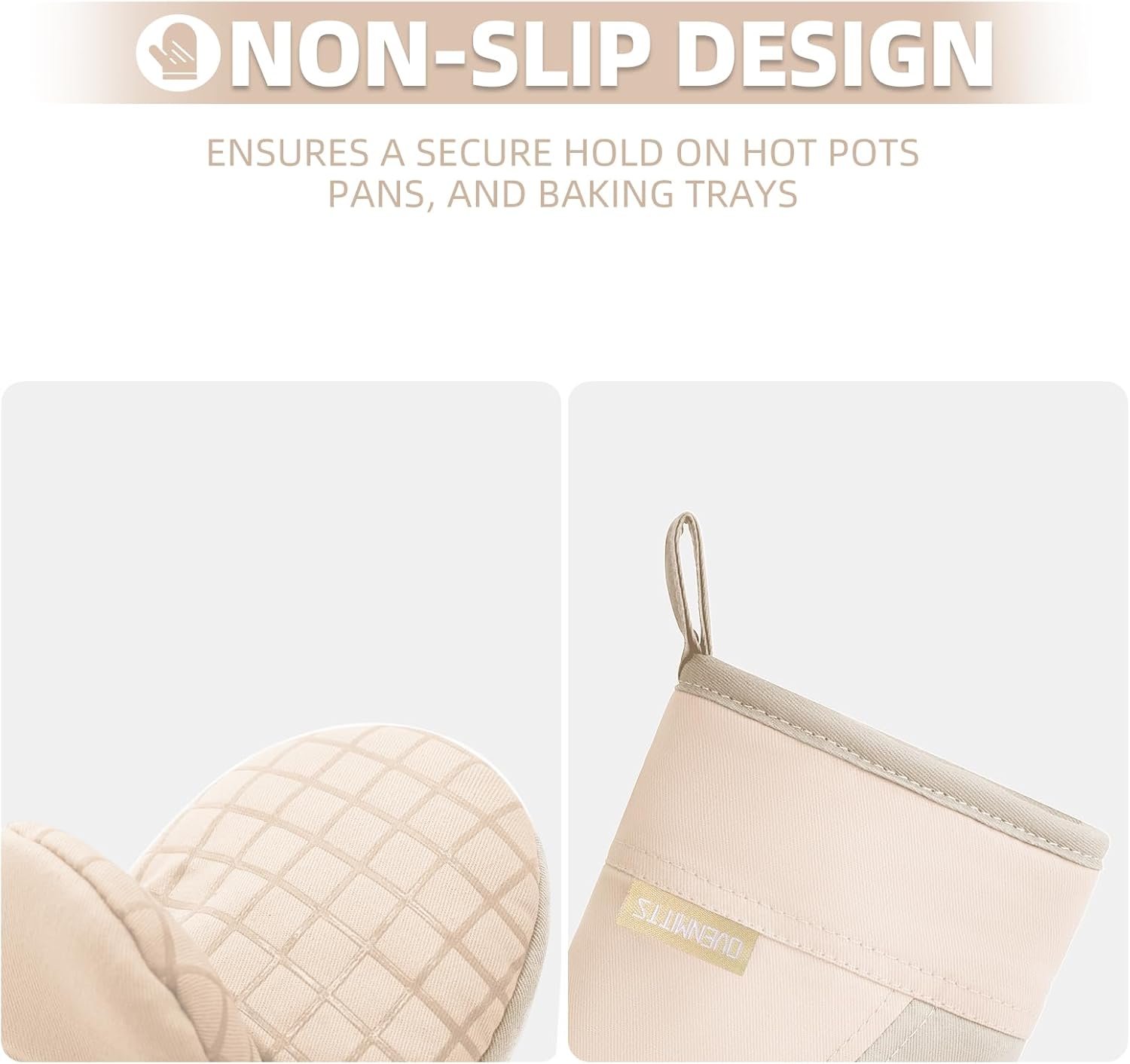 Mini Oven Mitts, Kitchen Oven Gloves Kitchen Mittens 500 Degrees Heat Resistant Baking Gloves, Non-Slip Silicone Surface with Hanging Loops Hot Gloves for Cooking, Baking, BBQ 1 Pair-Khaki