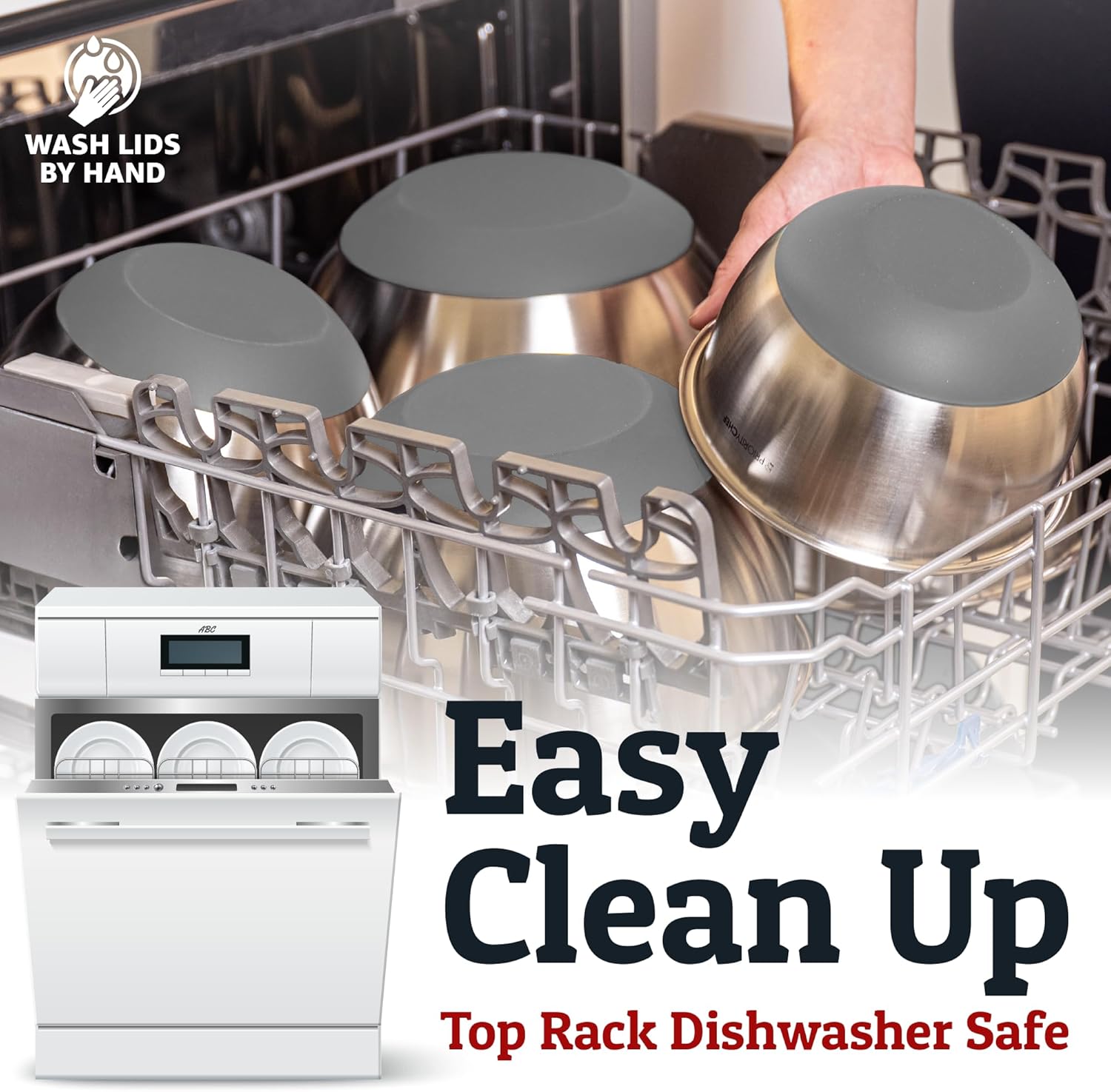- Comprehensive Size Variety: Elevate your culinary skills with our complete set of 5 stainless steel mixing bowls with lids set, ranging in size from 1.5 to 5 quarts. Whatever the task you'll find the perfect size for every task.