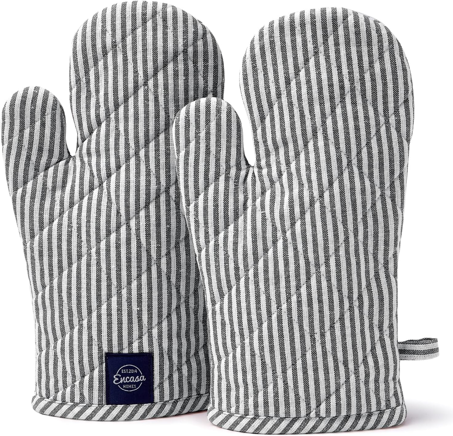 Encasa Homes Long 12"x7" Oven Microwave Hand Gloves Mitts (2 pc Set) for Kitchen Cooking & Baking - Heat Resistant, Thick & Safe, Protection of Hands from Hot Utensils - Ticking Black