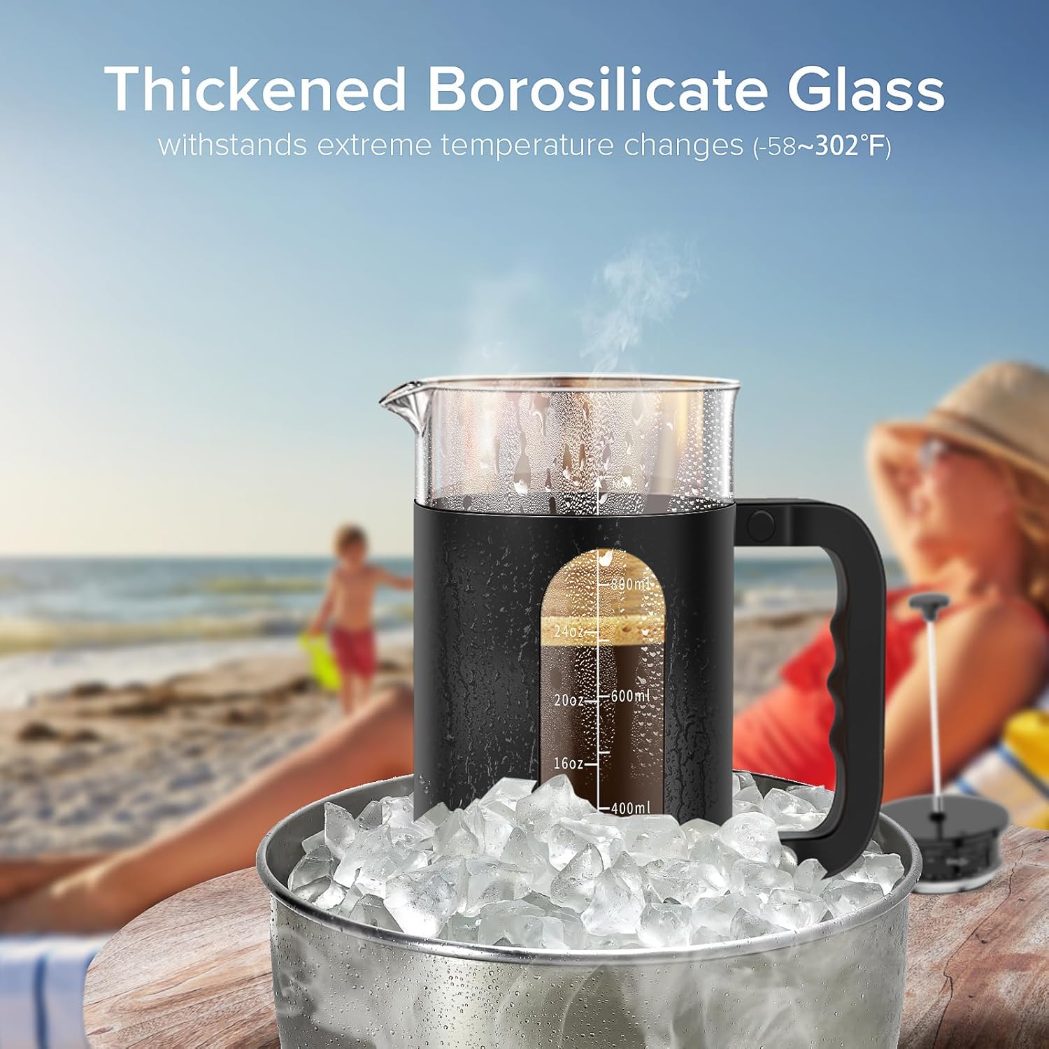 - 【EASY TO USE】Brew a cup of coffee in several minutes. The 34oz/1000ml french press makes the perfect cup of coffee. The french press coffee is the easiest to concentrate on the condition of the beans among the many devices. You can see the amount of foam (crema) after the coffee touches the water, and how the coffee floats on the water and slowly sinks
