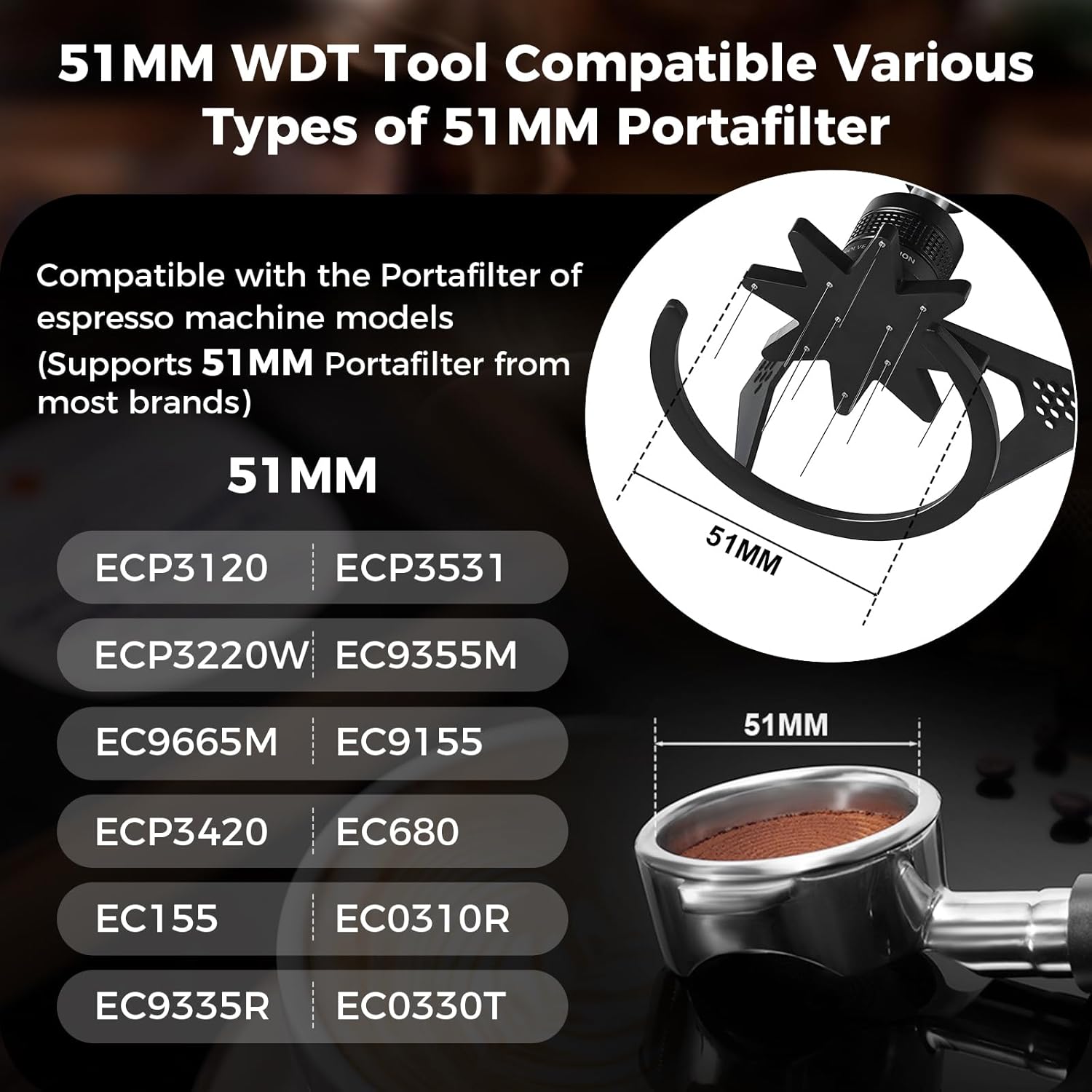 - Improve Consistency - With this WDT distribution tool, simply stir the ground coffee to break up clumps and enjoy a more even distribution before mashing. It's the perfect blend of rigidity and flexibility that makes making coffee aesthetically pleasing.The wdt tool espresso 51mm compatible with various espresso machines, such as De'Longhi ECP3120,ECP3531,ECP3220W,EC9355M,EC9665M,EC9155,ECP3420,EC680,EC155,ECO310R,EC9335R,BC0330T,etc. and the 51mm portafilters of other espresso machines