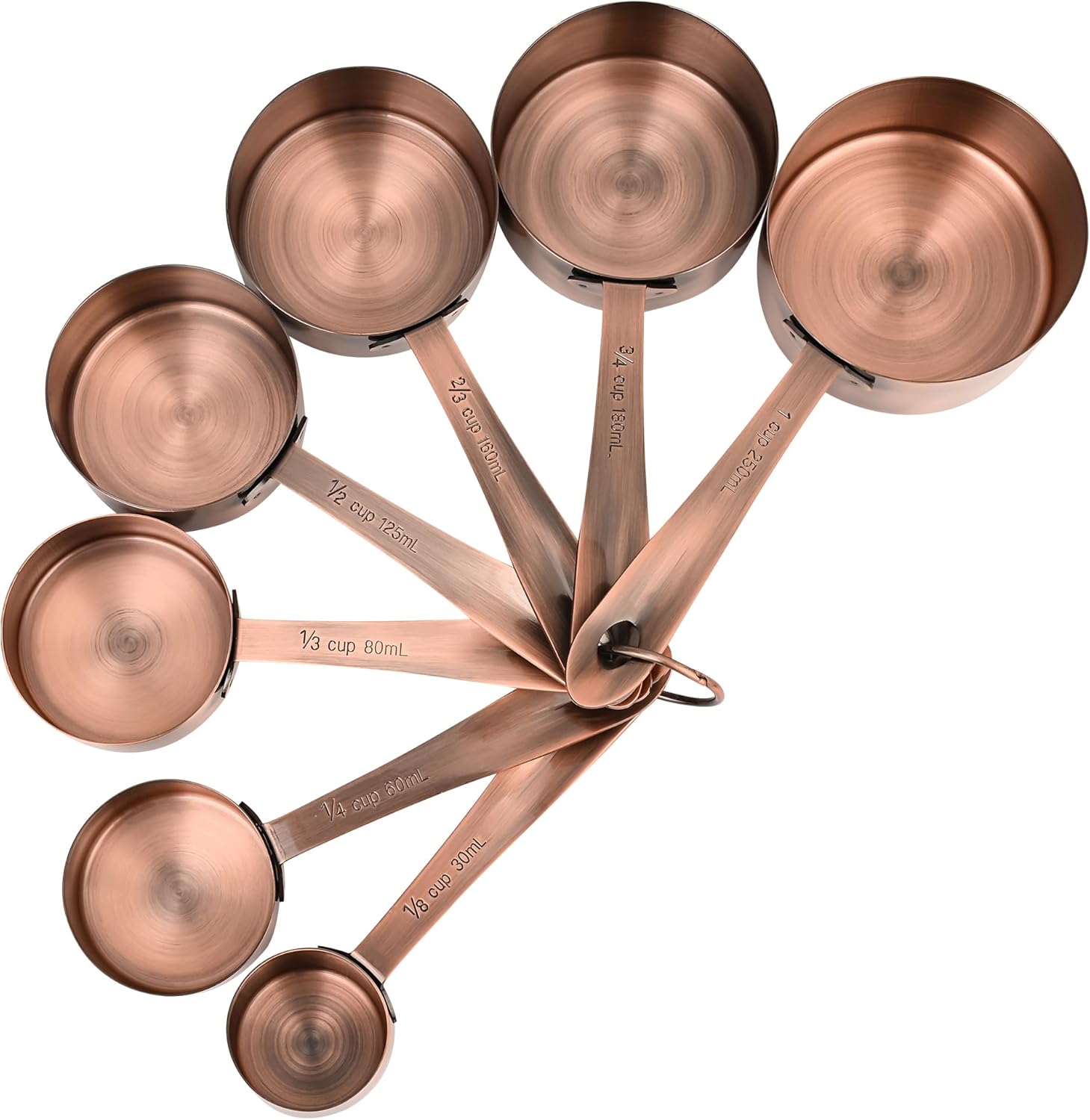 - ▲▲MEASURING CUPS AND SPOONS SET OF 17: 7 copper measuring cups set:1/8CUP-30ML;1/4CUP-60ML;1/3CUP-80ML; 1/2 CUP-125ML;2/3 CUP-160ML; 3/4 CUP-180ML;1CUP-250ML; 9 copper measuring spoons set:1/16tsp-0.32ML;1/8tsp-0.63ML;1/4tsp-1.25M;1/2 tsp-2.5ML; 3/4tsp-3.75ML;1tsp-5ML;1/2tbsp-7.5ML;2/3tbsp-10ML; 1tbsp-15M;1 X Leveler.