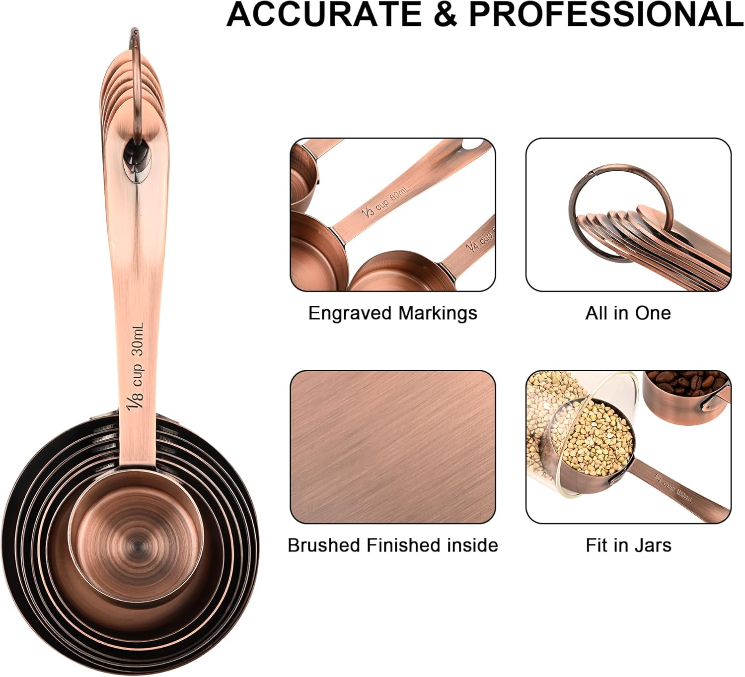 - ▲▲ENGRAVED MEASURING MARKINGS – Every copper measuring cups and spoons in this set has the accurate measurements size in US and Metric engraved on the handle clearly, what will help you reduce any measuring errors for cooking or baking!