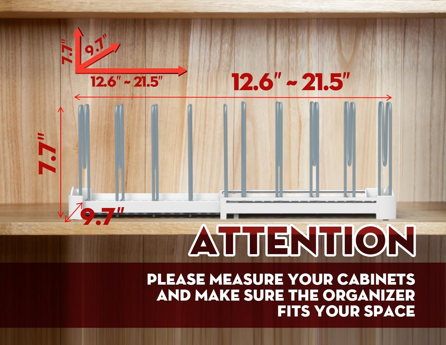 - Pot Lid Organizer - Organizes pot lids, container lids, cake molds, cutting boards, drying mats etc. Product size is 9.7'' deep, 7.7'' high, extendable width is from 12.6'' to 21.5''.