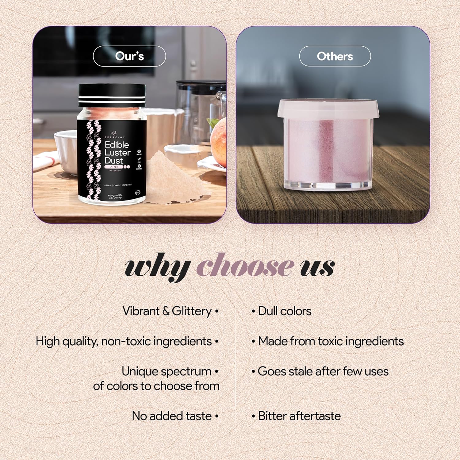 BeePoint Pink Edible Luster Dust 15g - Food Grade, Vibrant Color Shimmer Powdered Dust for Drinks, Cocktails, Cake Decorating, Baking, Chocolates, Candy, Sweets, & Cookies - Vegan & Gluten Free