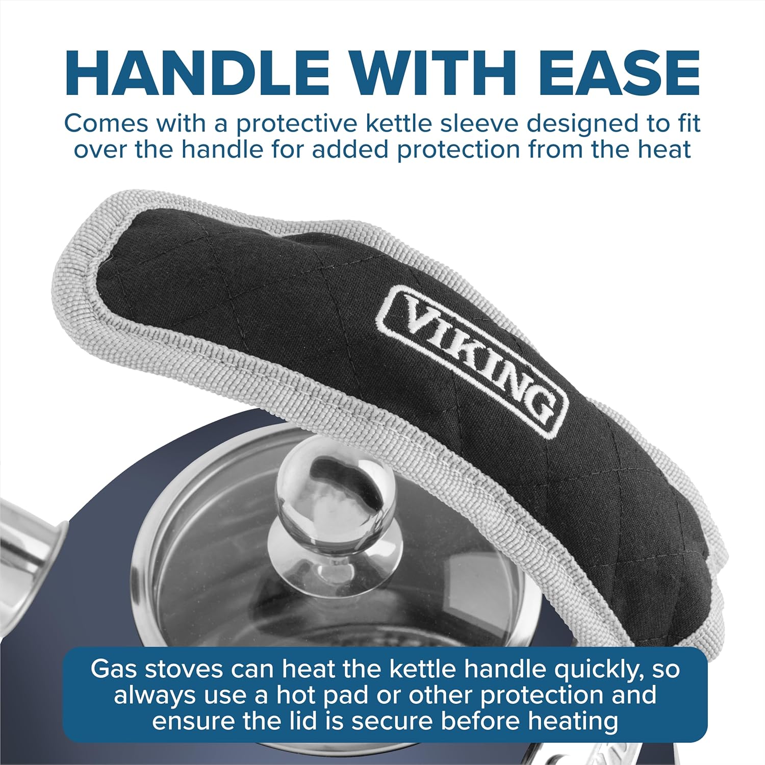 Viking 3-Ply Stainless Steel Tea Kettle, 2.6 Quart Stovetop Hot Water Pot with Tempered Glass Lid, Ergonomic Handle, Induction Ready, Slate and Blue
