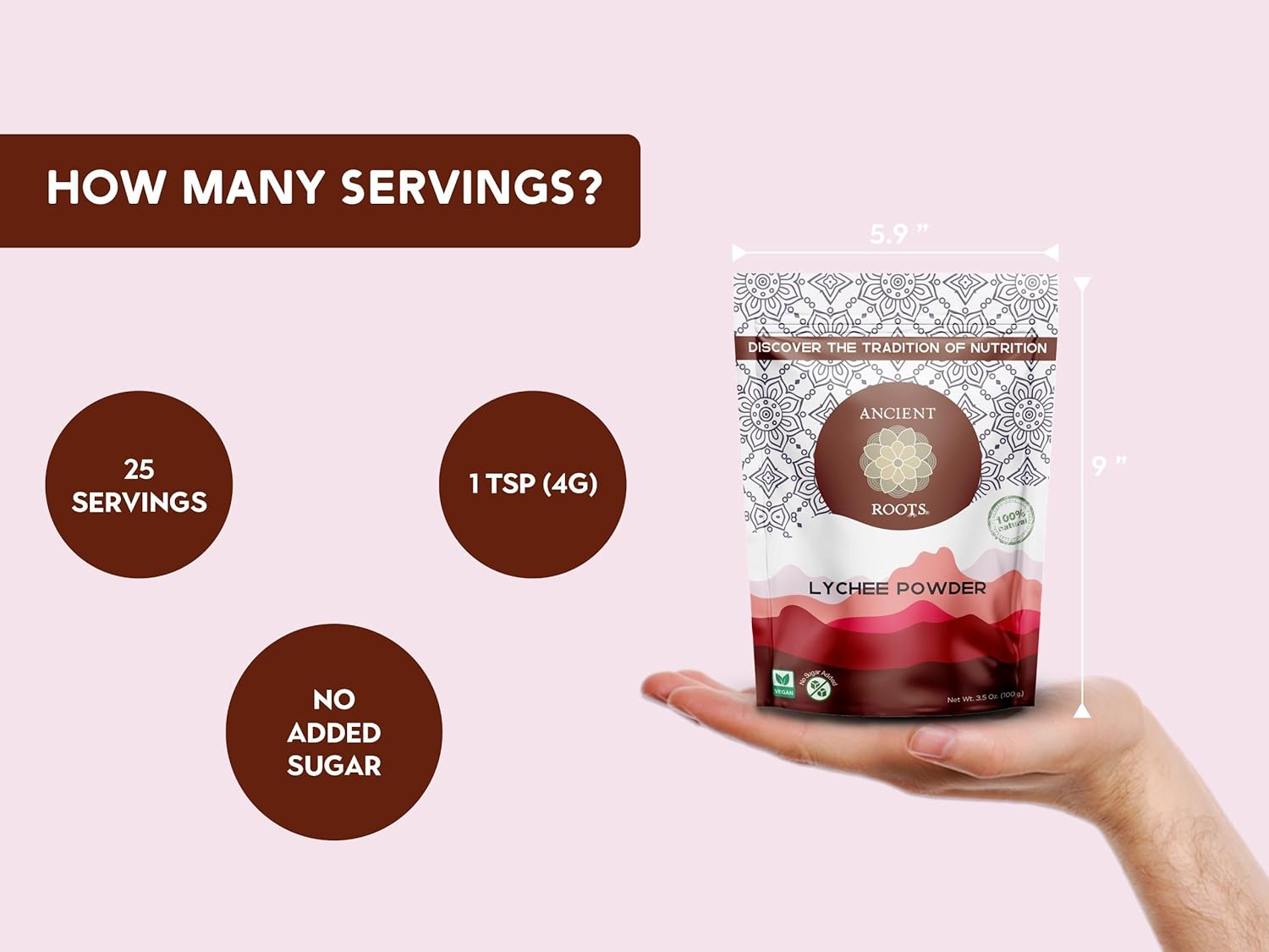 Ancient Roots Freeze-Dried Lychee Fruit Powder – 100% Organic, All-Natural Food Coloring, Rich in Antioxidants, No Added Sugar or Preservatives, 25 Servings (3.5 oz)