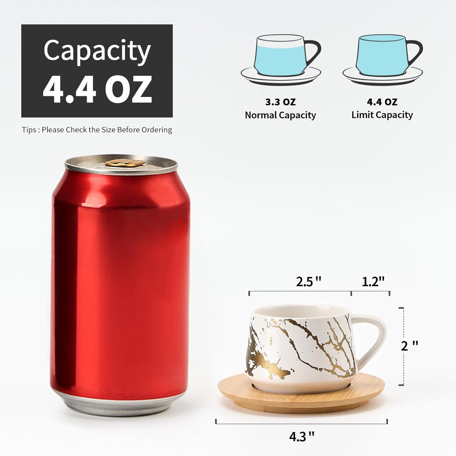 - 【SAVE COUNTER SPACE】 Each Cup: Dia:2.5", H:2". Capacity(full): 4oz /130 ml. Each saucer: Dia:4.3 ", H:0.5 ".The combination of the coffee cup set and the iron frame can prevent the cups and saucers from being randomly placed.They are the best collocation in your life.