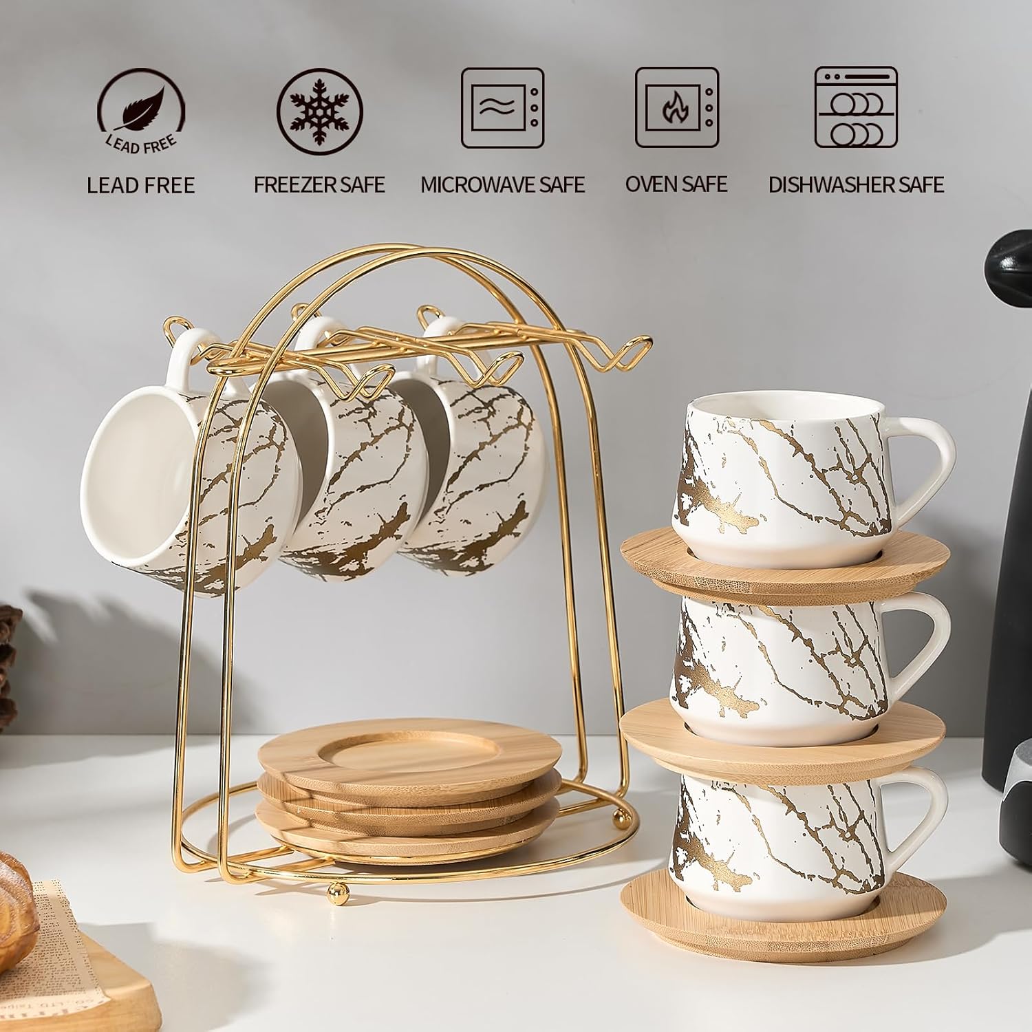 LUKA Ceramic Espresso Cups with Saucers and Metal Stand, Small 4 oz Porcelain Demitasse Cups Set of 6, Cute Cappuccino Coffee Cups for Double Espresso, Tea, Marbling White