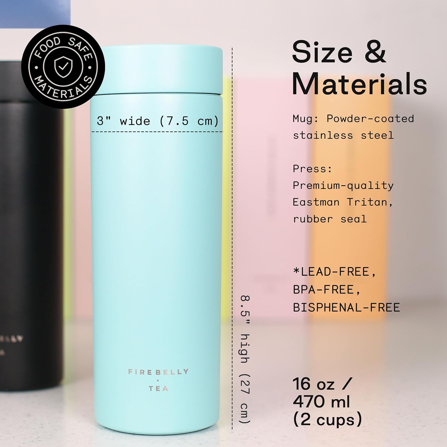 Firebelly Tea, Travel Tea Infuser Mug with Strainer, Insulated Tumbler for Loose Leaf Tea or Coffee, Leakproof Bottle for Hot or Iced Drinks, Stainless Steel Thermos with Lid, Mer