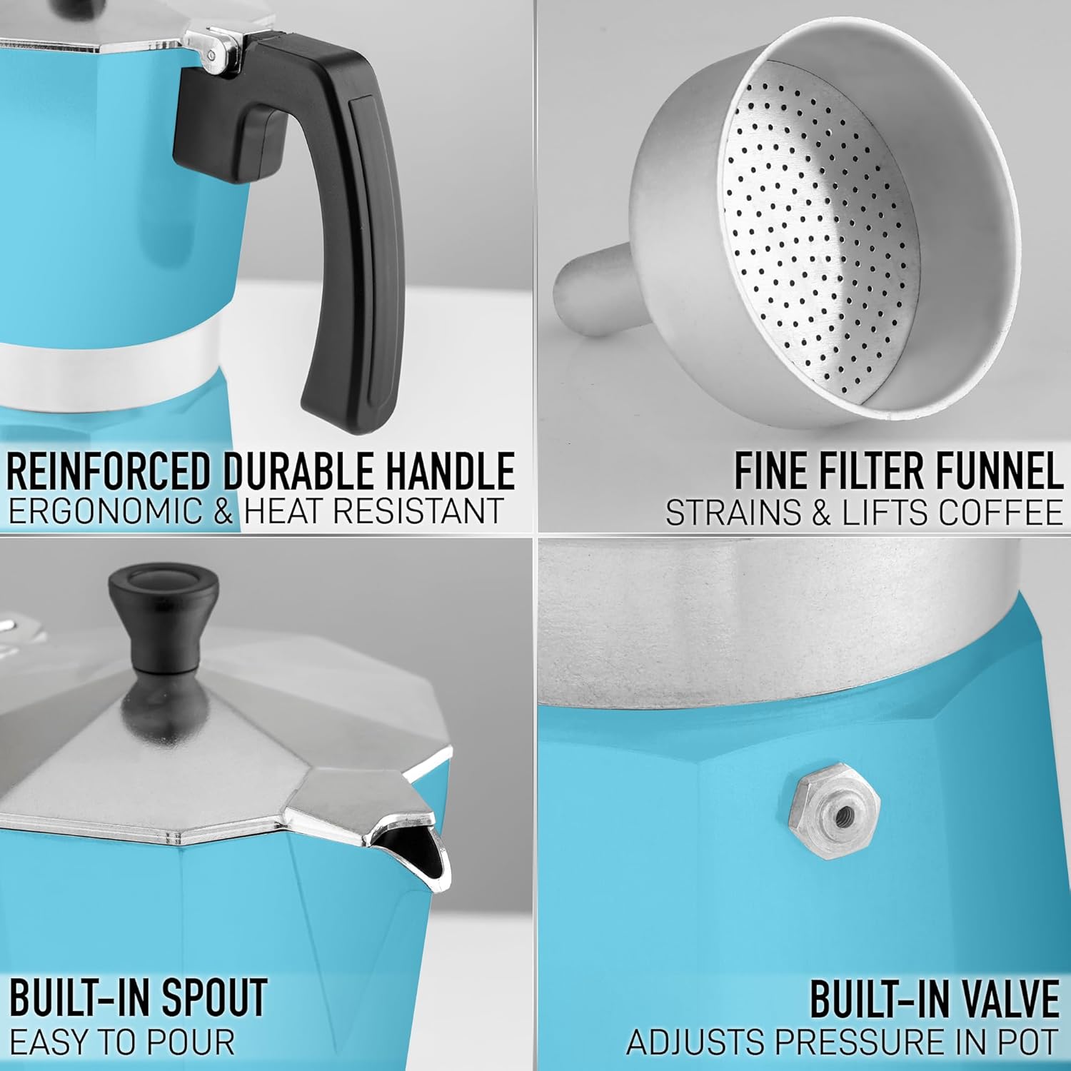 - PREMIUM QUALITY DESIGN: Our Italian coffee maker crafted with a durable, food-grade cast aluminum body, the classic Italian design of this espresso pot ensures quick and even heat distribution for a rich and velvety coffee flavor. This stove top espresso coffee maker has a built-in safety valve to regulate pressure inside the espresso pot for higher caffeine extraction. This espresso maker stove top is designed with a heat-resistant handle, lid knob, and a built-in spout for easy pouring.