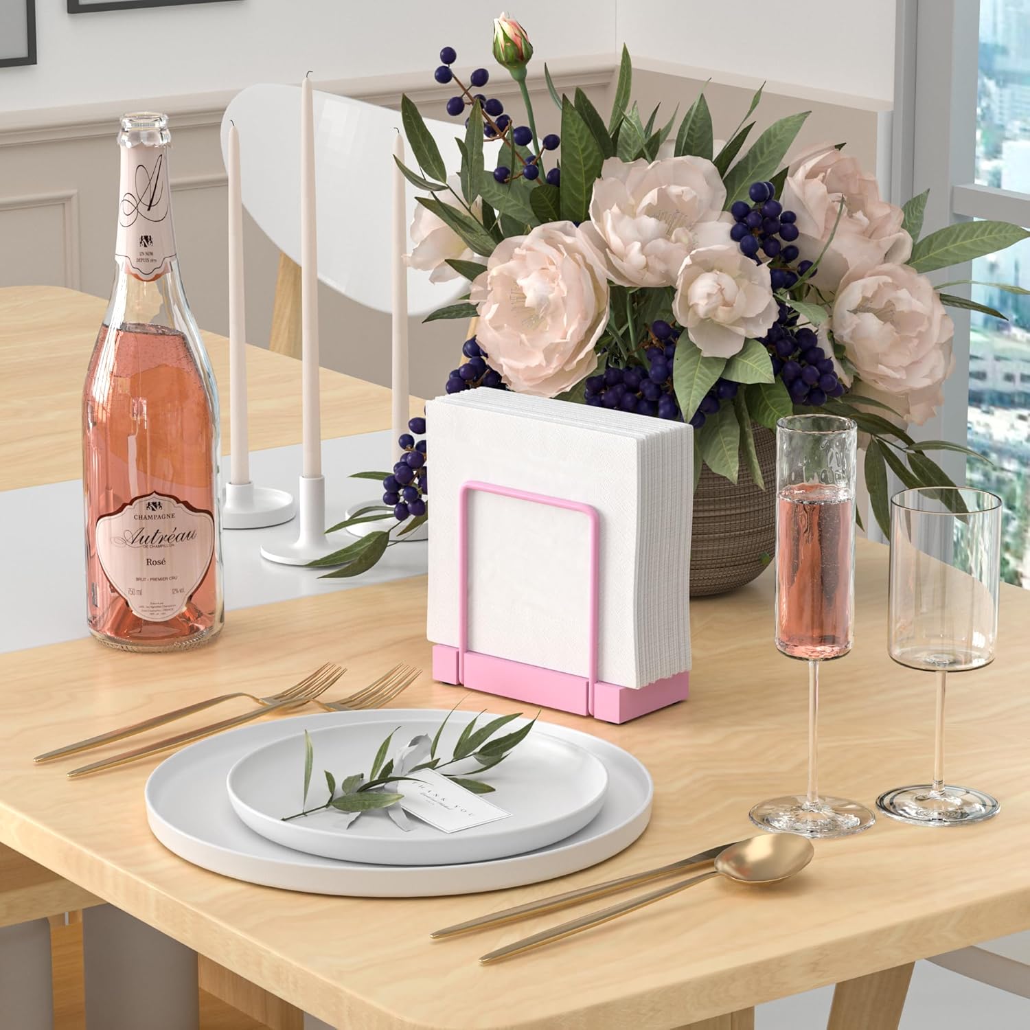 Wican Napkin Holder for Table, Pink Kitchen Accessories Appliances for Table Farmhouse Cocktail Picnic Rustic Bamboo Iron Wood Holders for All Dining Room Decor Pink