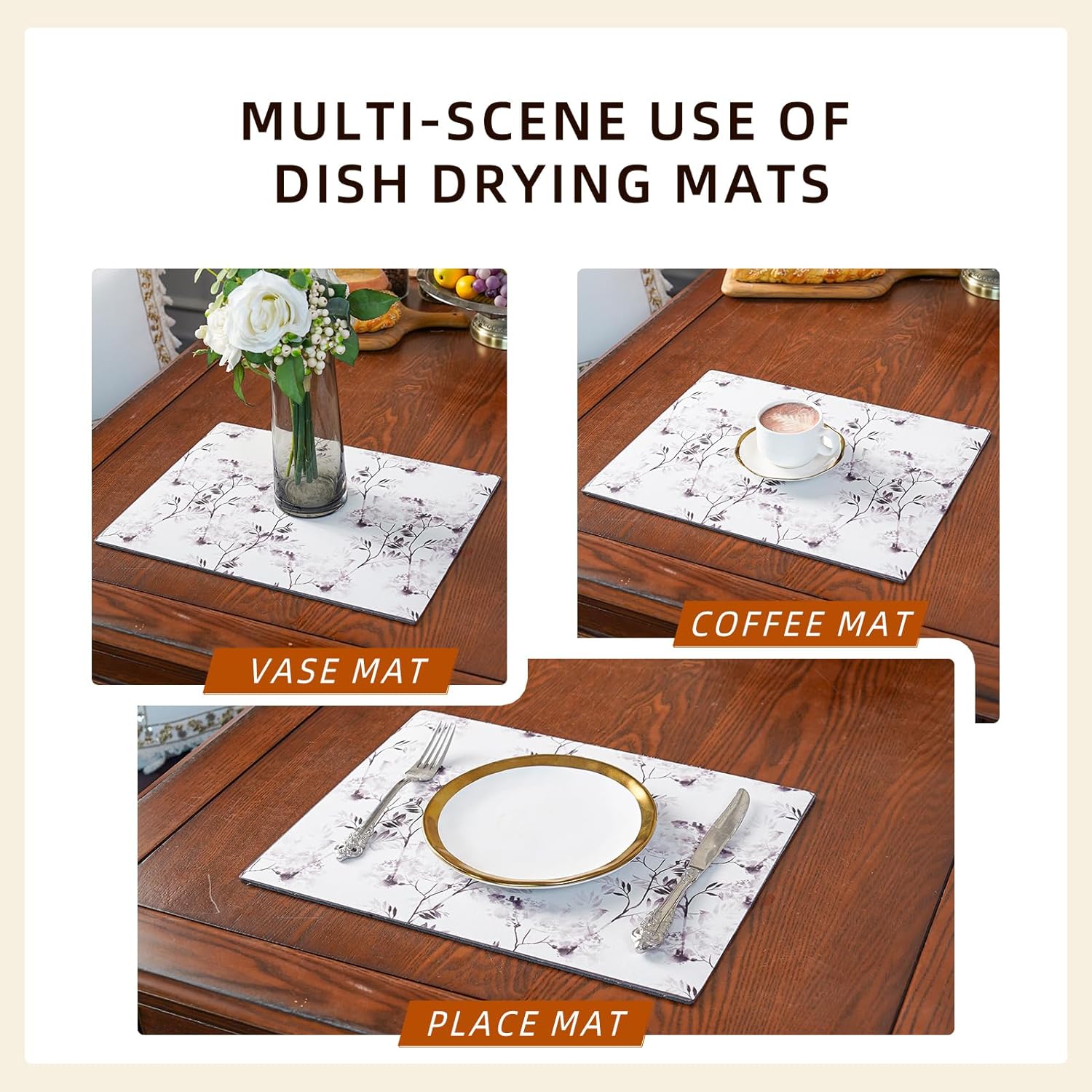 Dish Drying Mat Diatomaceous Earth Soft Coffee Mat, Silicone Dish Drying Mat for Kitchen Counter or Sink for Kitchen Bathroom Coffee Bar (Inked Flower, 16 x 24 Inches)