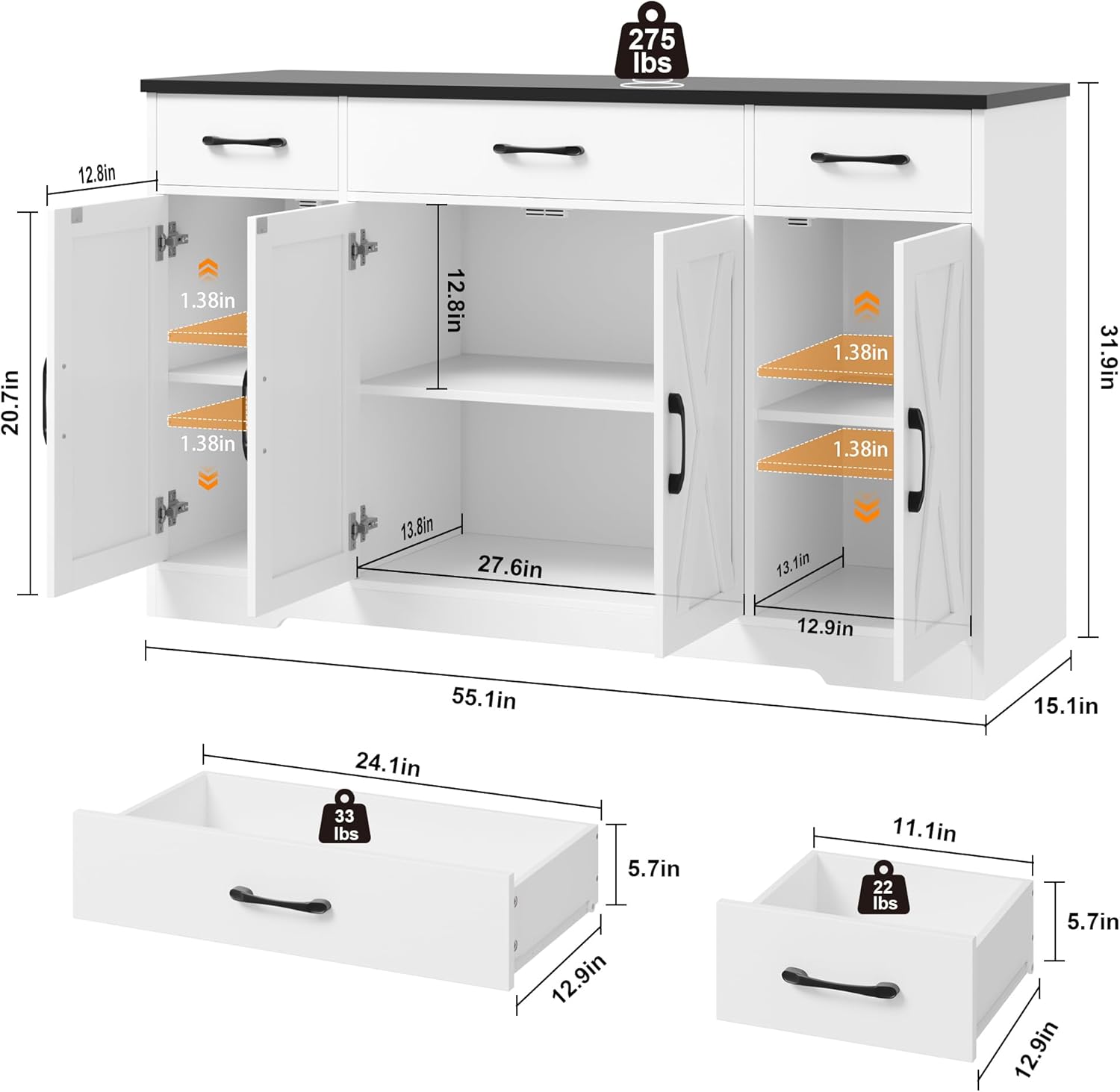 HOSTACK Buffet Sideboard Cabinet with Drawers, 55" Large Buffet Storage Cabinet with Shelves and Doors, Modern Farmhouse Coffee Bar Station Wood Kitchen Table for Kitchen, Dining Room, White/Black