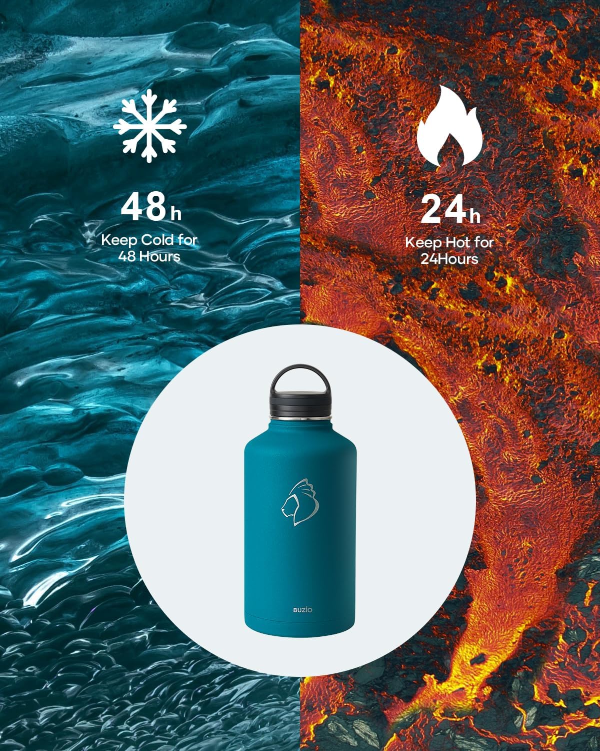 - 48H Cold & 24H Hot: Made of Triple wall 18/8 food-grade stainless steel, BUZIO ThermoArmour water bottle keeps liquids icy for up to 48 hours or hot for up to 24 hours, ensuring refreshing hydration all day even during the hot summer.