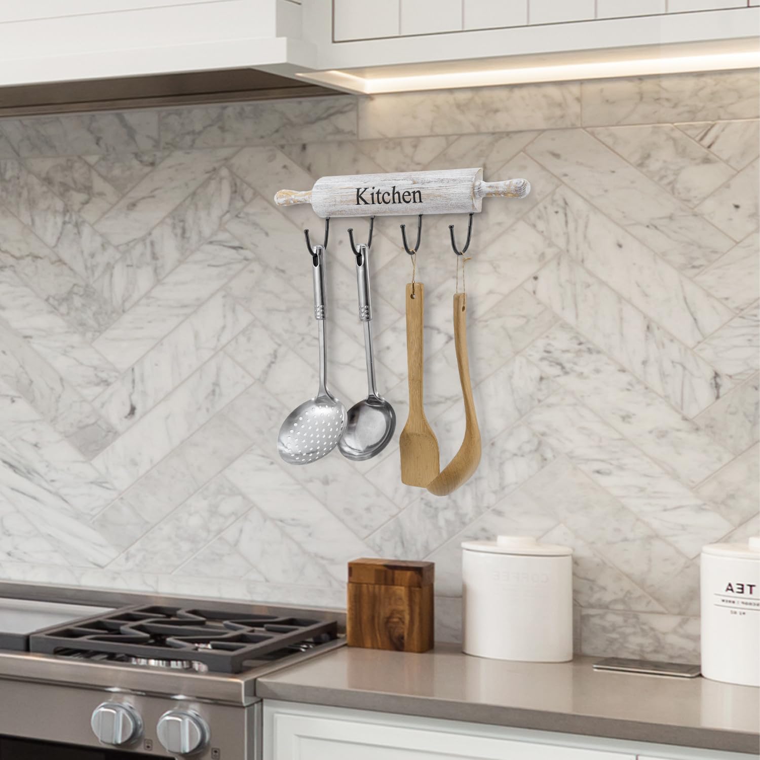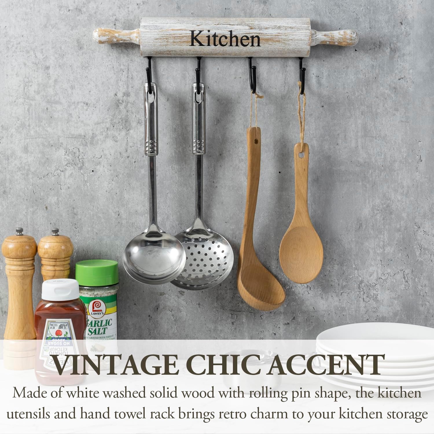 - This kitchen utensil rack boasts a rustic aesthetic, adding warmth and character to your kitchen decor; Crafted with natural wood and featuring a rolling pin design and whitewashed finish, it effortlessly blends into both modern and traditional kitchen settings, elevating the ambiance of your space
