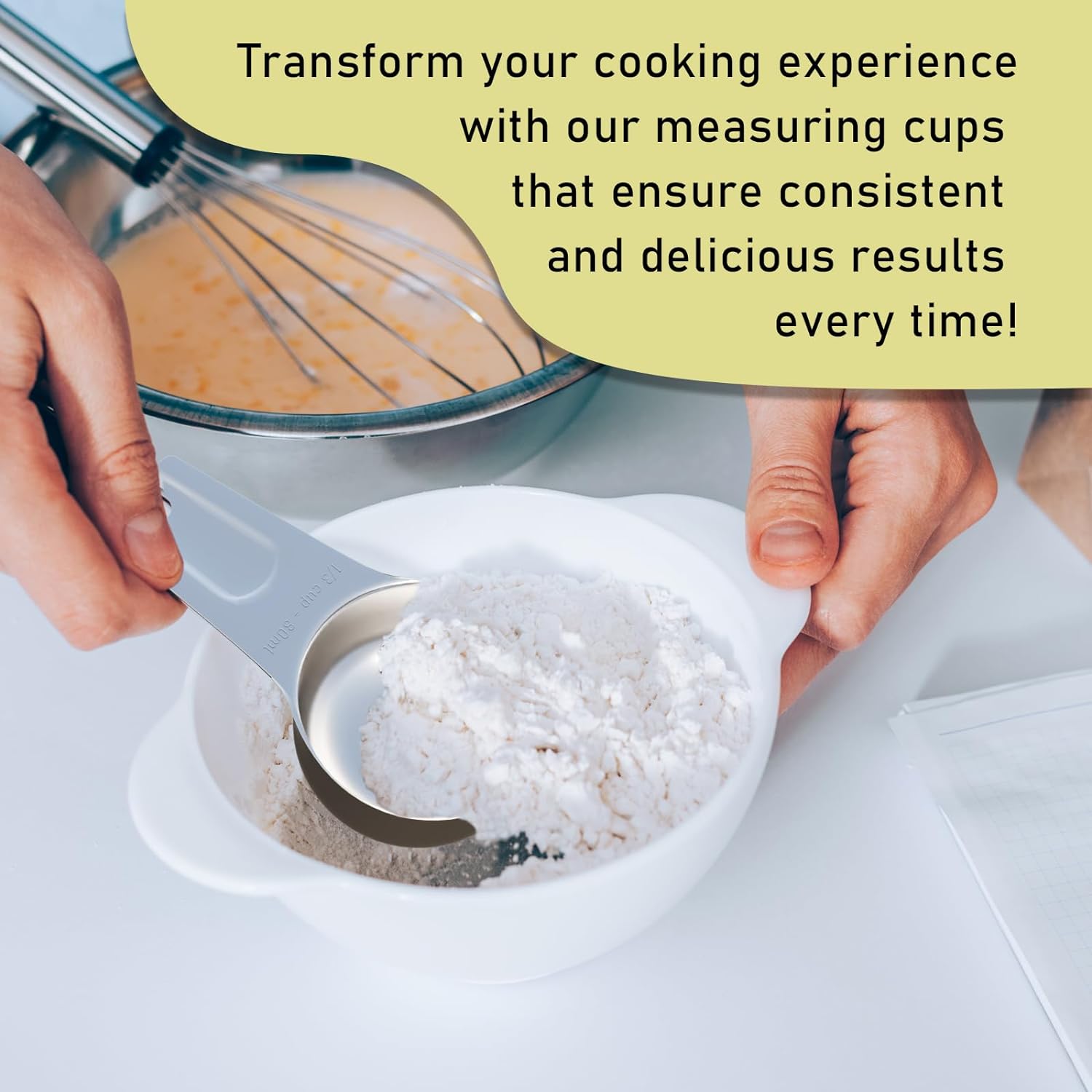 - 【Easy to Use】 Measuring cups have a smooth surface, excellent touch, easy to clean, never rust, and the hole in the handle allows you to hang them up and save space in the kitchen