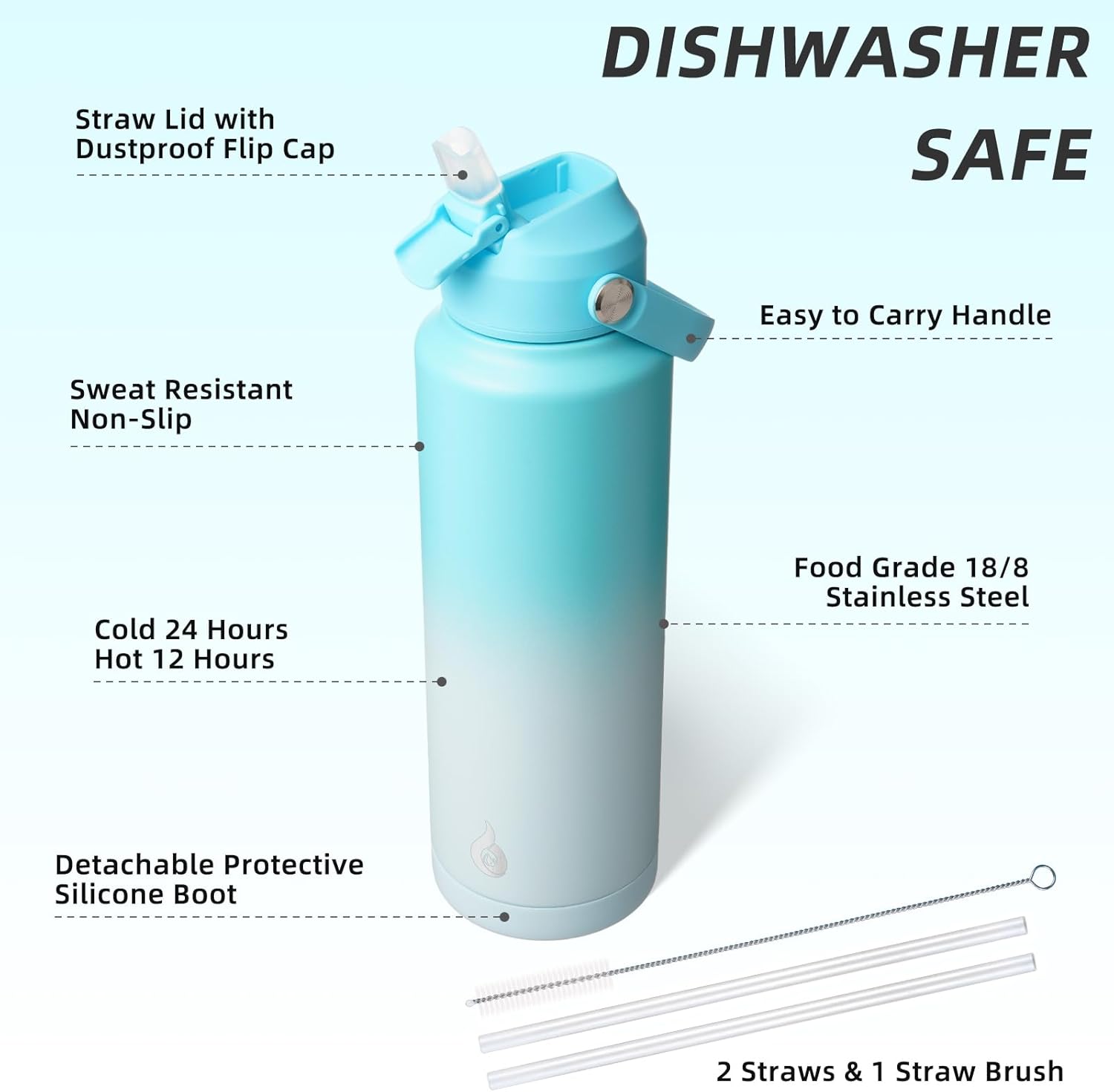 - NON-SLIP PROTECTIVE BOOT & DISHWASHER SAFE: This stainless steel water bottle comes with a detachable silicone boot to protect the bottom from bump damage. The wide mouth design of our water cup allows for easy filling, pouring, and cleaning. With 2 straws and 1 straw brush, you can easily clean the nozzle and straw with straw brush. It is also dishwasher safe, saving you time and effort in maintaining its cleanliness and hygiene