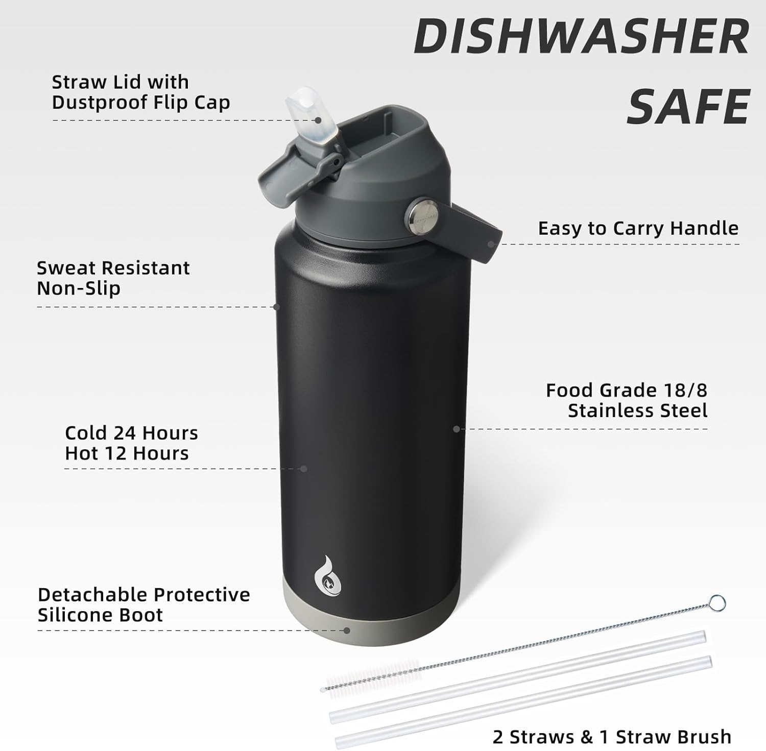 BJPKPK Water Bottle with Straw Lid, 32oz Vacuum Insulated Water Bottles, Metal Stainless Steel Thermos for Sports, Travel, BPA Free Leak Proof Thermos, Cups, Flasks, Tumblers,Black