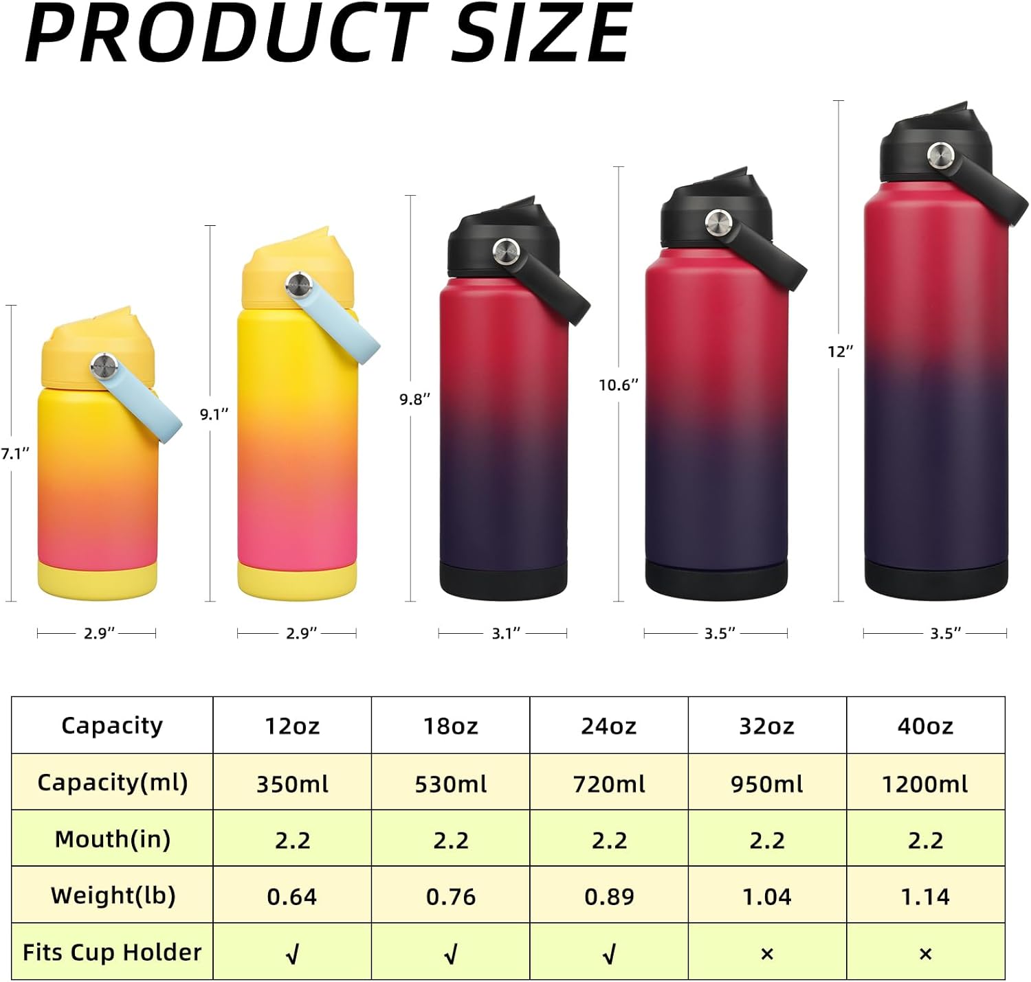 - MULTIPLE CHOICE & REUSABLE: Comes with multiple fashion colors and various sizes (12 oz, 18 oz, 24 oz, 32 oz, 40 oz) to choose from according to your need. 12 oz, 18 oz and 24 oz cups can put in your car cupholder. Get more out of your outdoor adventures with our reusable water bottle that can be refilled multiple times, reducing single-use plastic waste and promoting a sustainable lifestyle