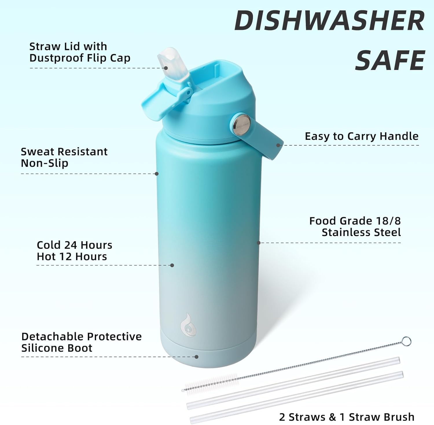 - NON-SLIP PROTECTIVE BOOT & DISHWASHER SAFE: This stainless steel water bottle comes with a detachable silicone boot to protect the bottom from bump damage. The wide mouth design of our water cup allows for easy filling, pouring, and cleaning. With 2 straws and 1 straw brush, you can easily clean the nozzle and straw with straw brush. It is also dishwasher safe, saving you time and effort in maintaining its cleanliness and hygiene