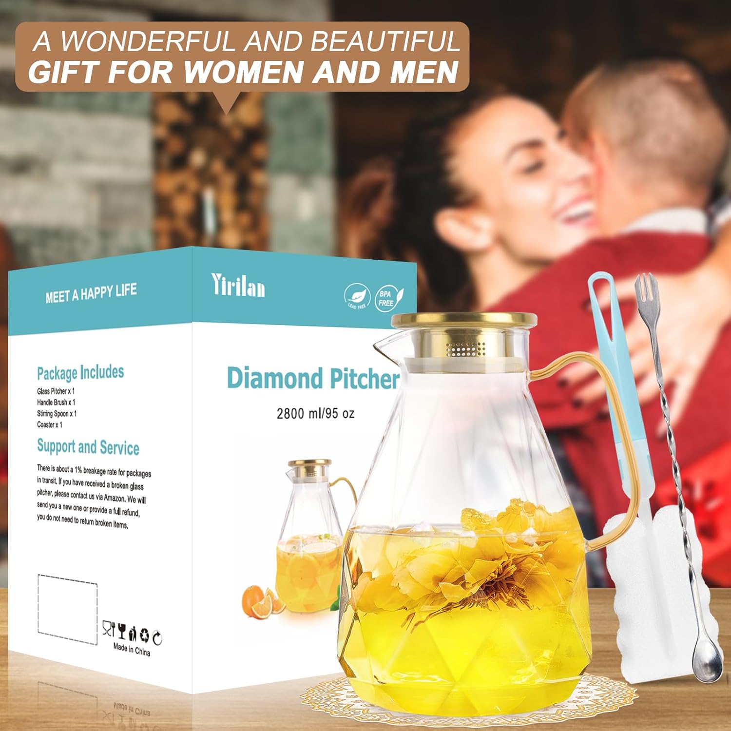 - A Wonderful Choice As A Gift: The practical and beautiful juice pitcher can basically meet your family's daily needs. I bet you will need a gift for Serving on Christmas, New Year's Day, Easter, Halloween, housewarmings, and Other parties. This glass jug has durable glass, an elegant body, and beautiful color box packaging, It is a beautiful gift for women and men