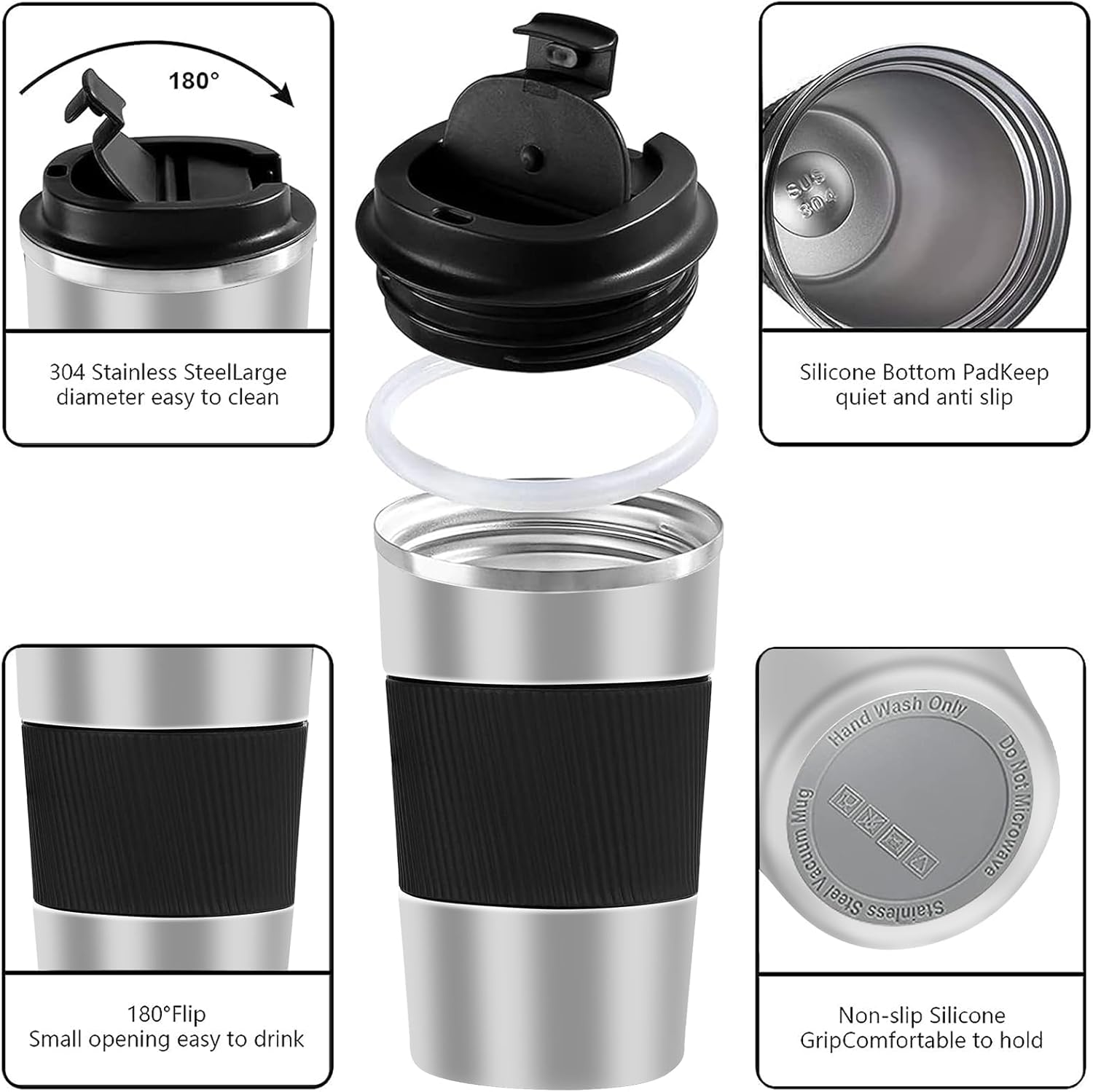 YINBAOGE Insulated Travel Coffee Mug Spill Proof Leak Proof Pobtable To Go Camping Stainless Steel Coffee Tumbler Reusable Coffee Cups with Lids Thermos for Hot and Cold Drink (Silver black, 17 OZ)