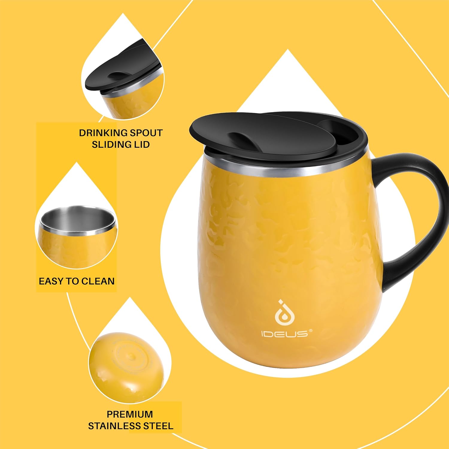Ideus 16 oz Insulated Coffee Mug with Handle and Lid, Double Wall Stainless Steel Vacuum Thermal Coffee Mug, Travel Coffee Cup Thermal Cup for Home and Office, Leopard Yellow