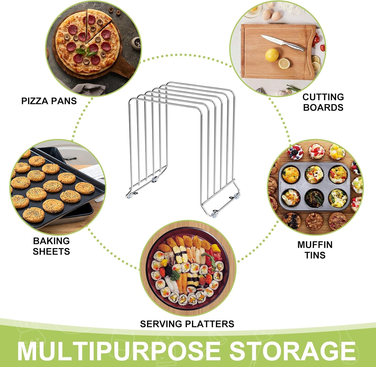 - 【SPACE SAVER】 This cutting board organizer can be put either on your kitchen countertop for daily use or in cabinet to organize to organize cutting boards and bakeware, keep everything organized and tidy, saving valuable kitchen space.