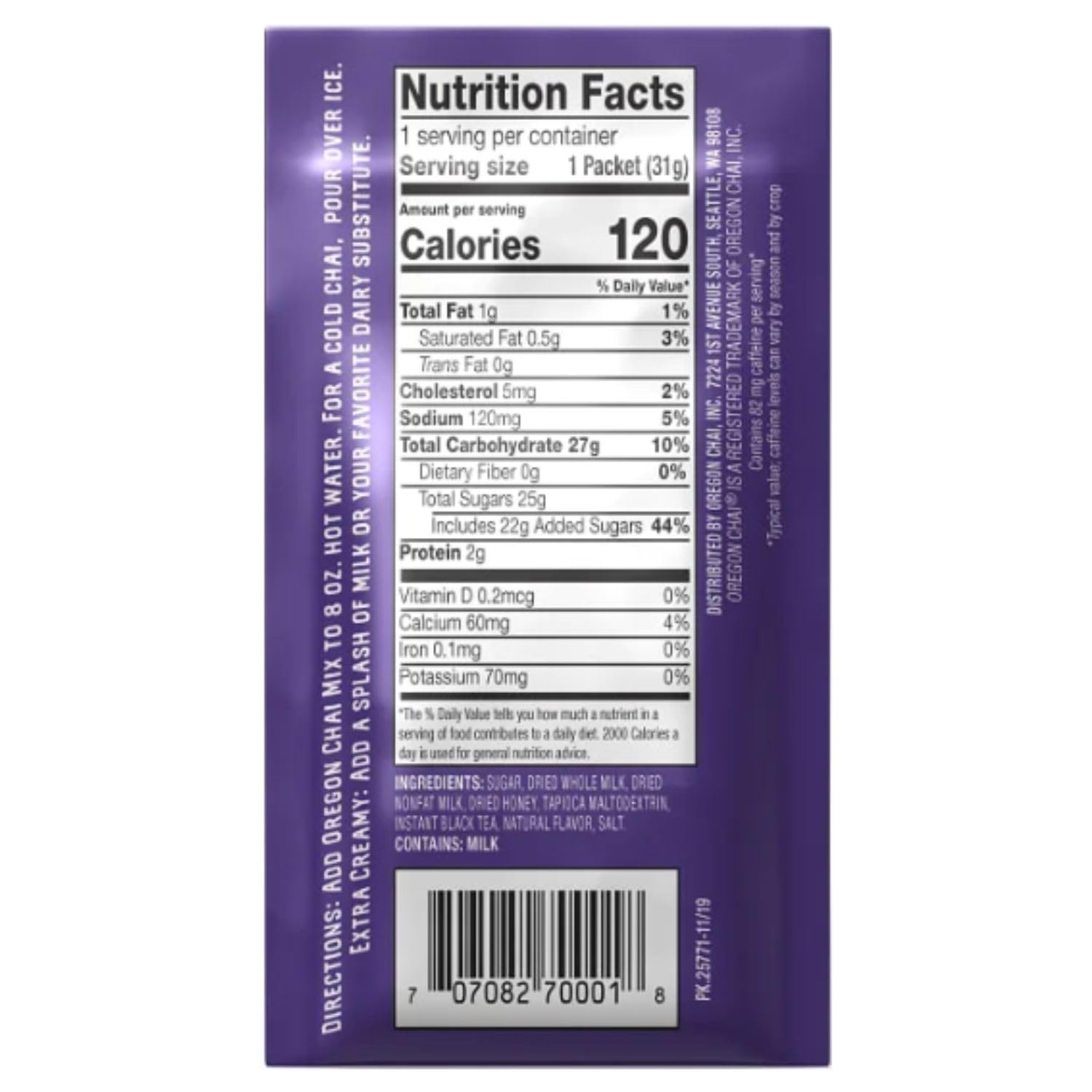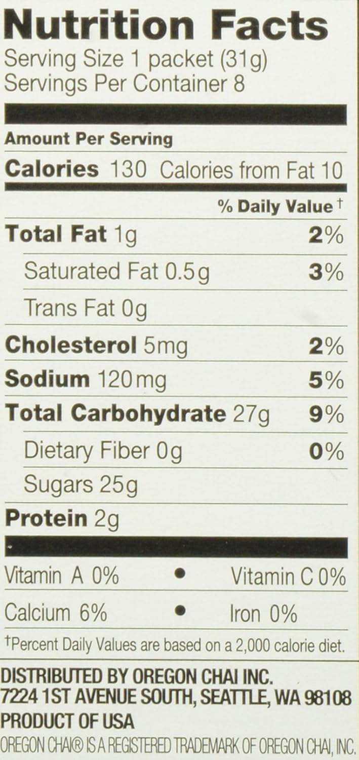 - Oregon Chai Original Dry Chai Latte Mix: Enjoy a chai tea latte now in a grab-and-go packet that you can pop in your bag and take anywhere. With Oregon Chai Tea Latte Powdered Mix packets you can enjoy chai any time, any place