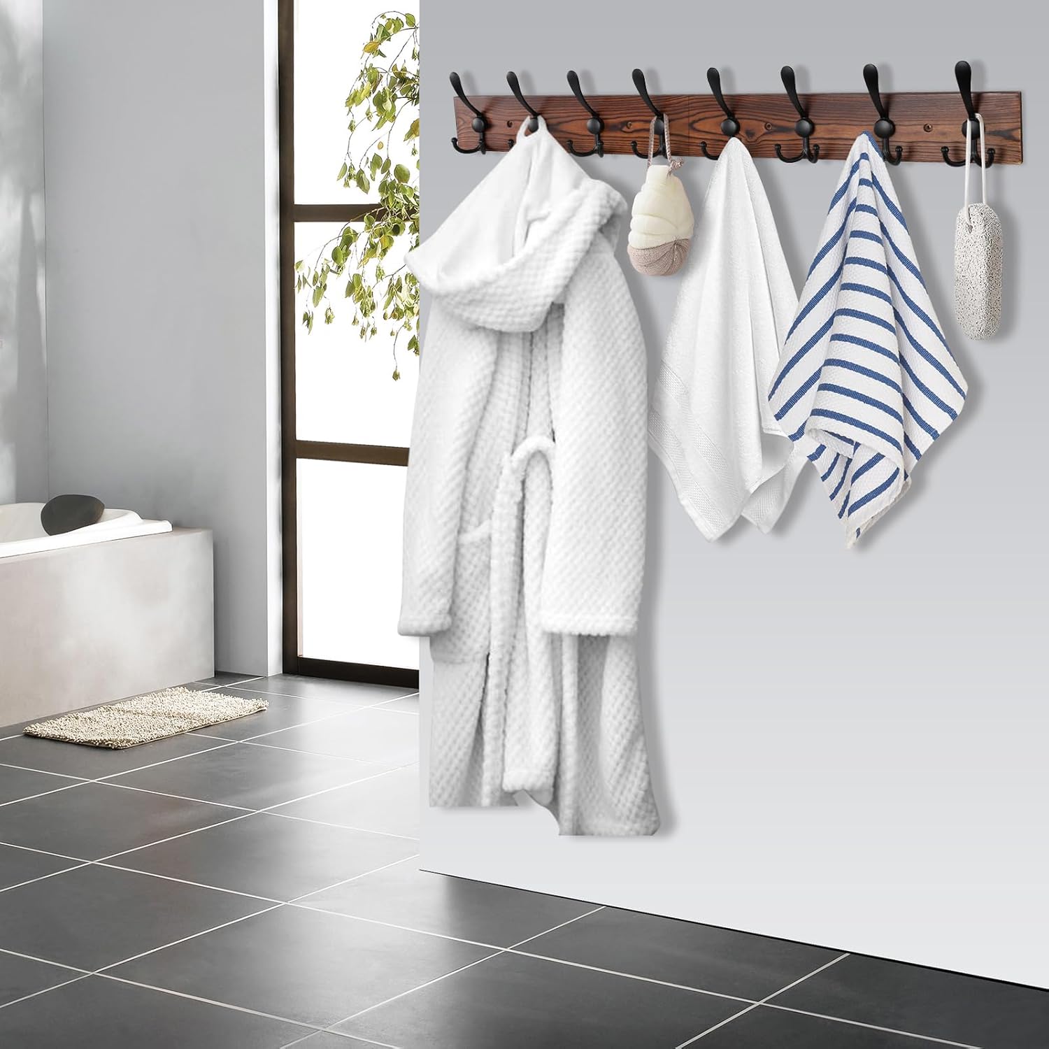 - [Practical Triple-hook]: The hook is split in three! You can hang many things on those. Perfect for hanging coats, bags, robes, clothes, scarves, backpacks, jackets, towels, hats, keys, umbrellas, purses, dog leashes and so on. It can make your room look more tidy and organized.