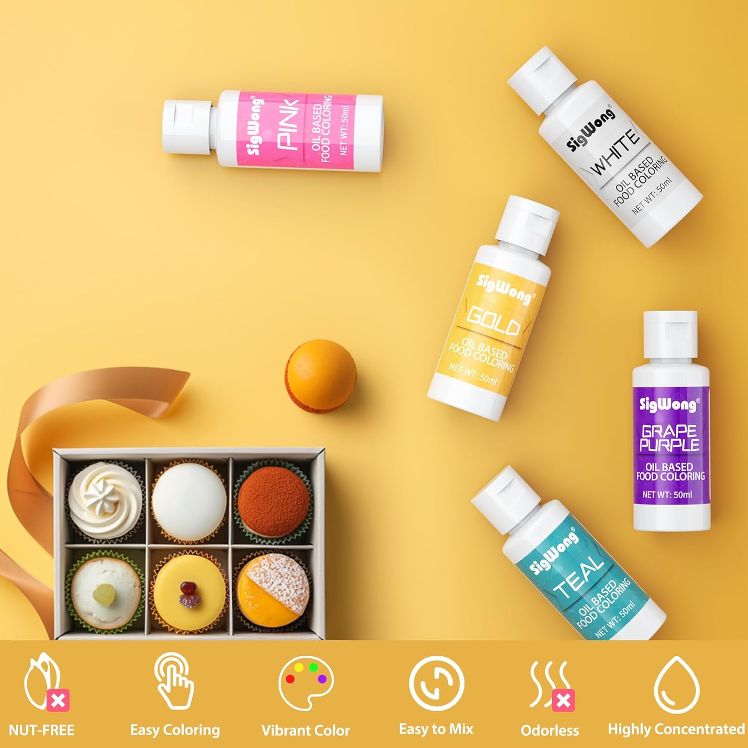 - FOOD SAFETY & HIGH QUALITY - Our oil-based food coloring are made from food-grade raw materials, are odorless and tasteless, and will not change the taste or texture of food. Candy colorants are somewhere between a liquid and a gel and have a much thicker texture than other food colorants. It is strong and uniform, so only a small amount of food coloring is needed to produce vibrant colors without graininess.