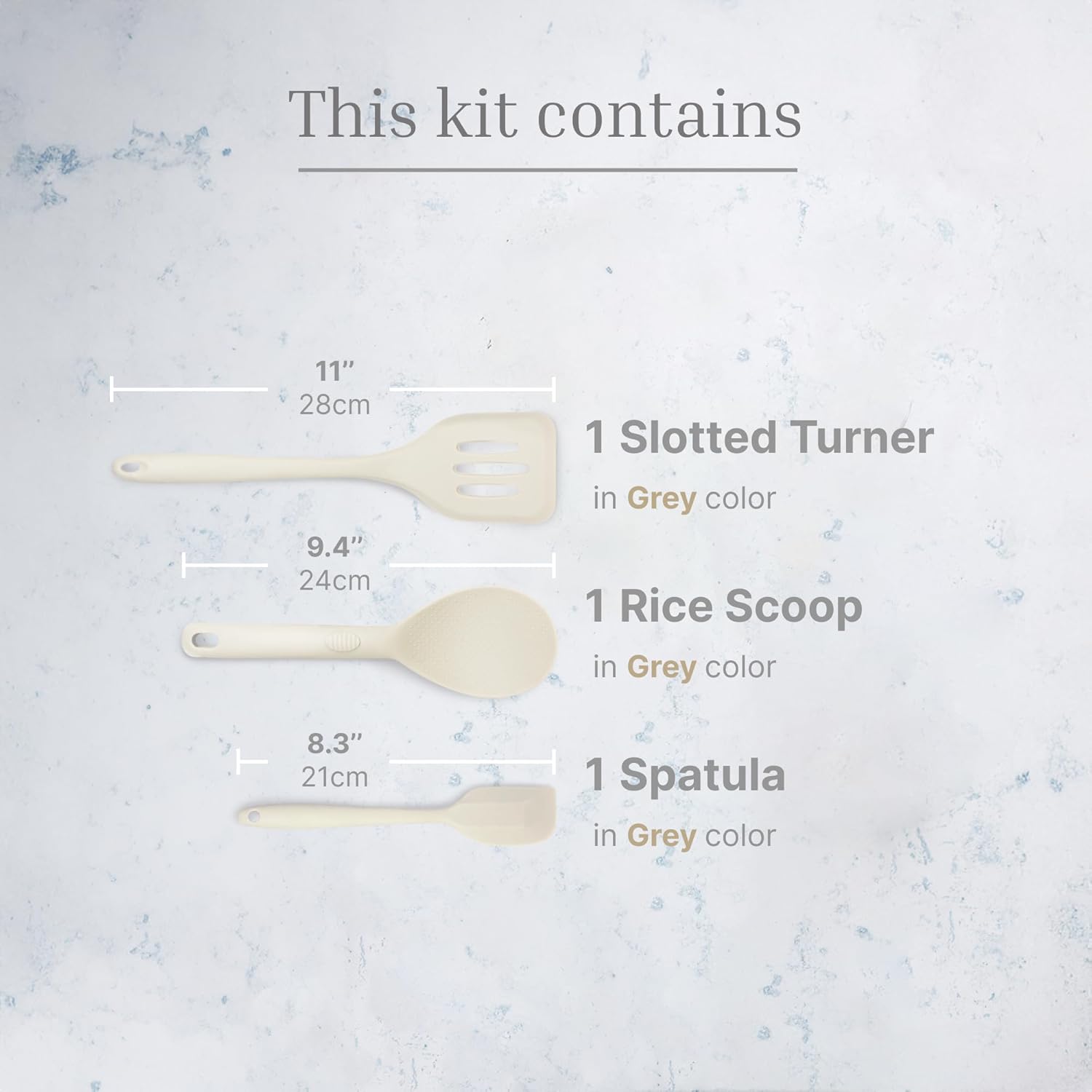 Silicone Utensils 3-Piece Set – Rubber Spatula, Slotted Turner, and Rice Paddle – Complete Heat-Resistant Set for Non-Stick Cookware – Kitchen Tools and Accessories for Cooking & Baking – Cream