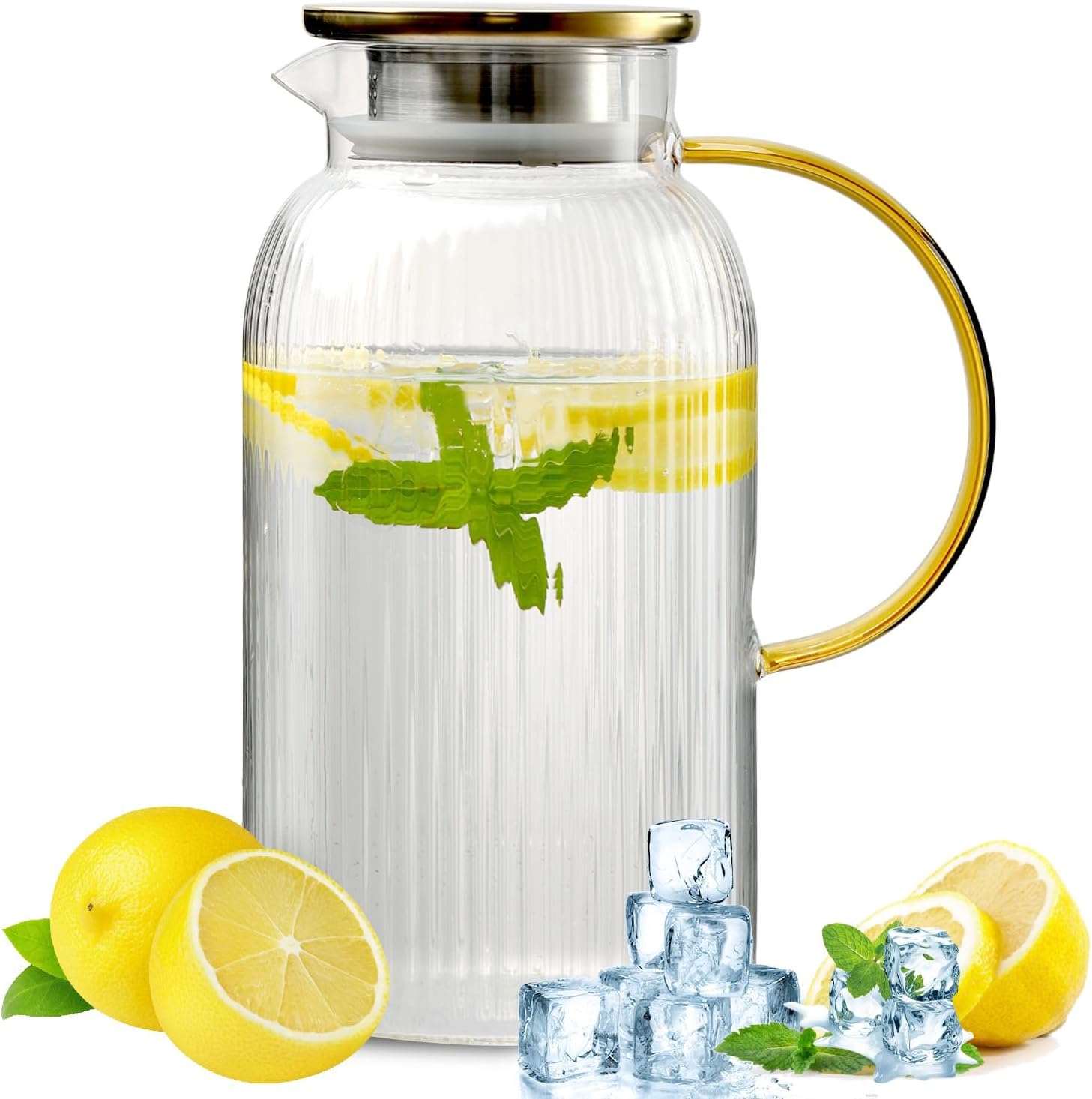 - Comfortable Design:Glass pitchers with handle and lid,the large handle can be held comfortably,and the stainless steel lid has two openings for pouring or filtering beverages.The rubber part around the lid ensures a tight seal,don't worry about spills