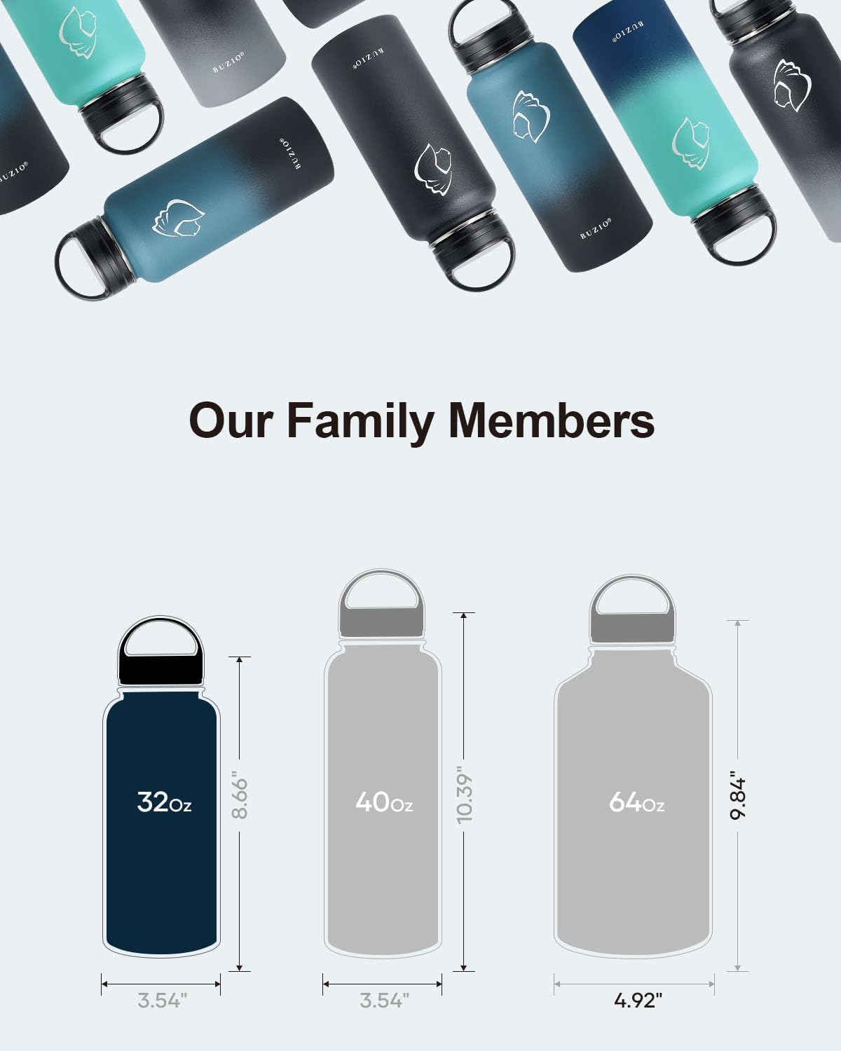 - There is Always One for you: BUZIO insulated water bottle meets your imagination in all aspects of drinking, from the comprehensive sizes (32oz-64oz) to classical and stylish designs, from the production materials to convenient accessories. Come to BUZIO, there is always one for you.