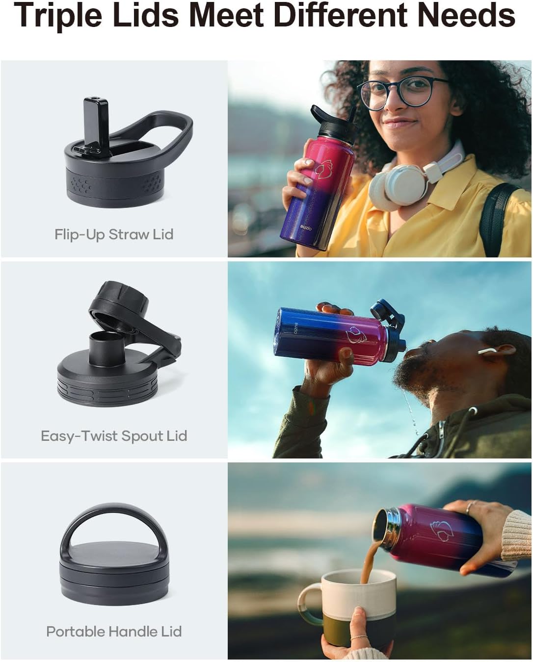 - 3 Caps Pack, 100% Leak-Proof: BUZIO stainless steel water bottle comes with 3 lids: portable handle lid, easy-twist spout lid, and flip-up straw lid to meet camping, hiking, cycling, fitness sports and more. Each lid has a thickened 360° seal for 100% leak-proof.