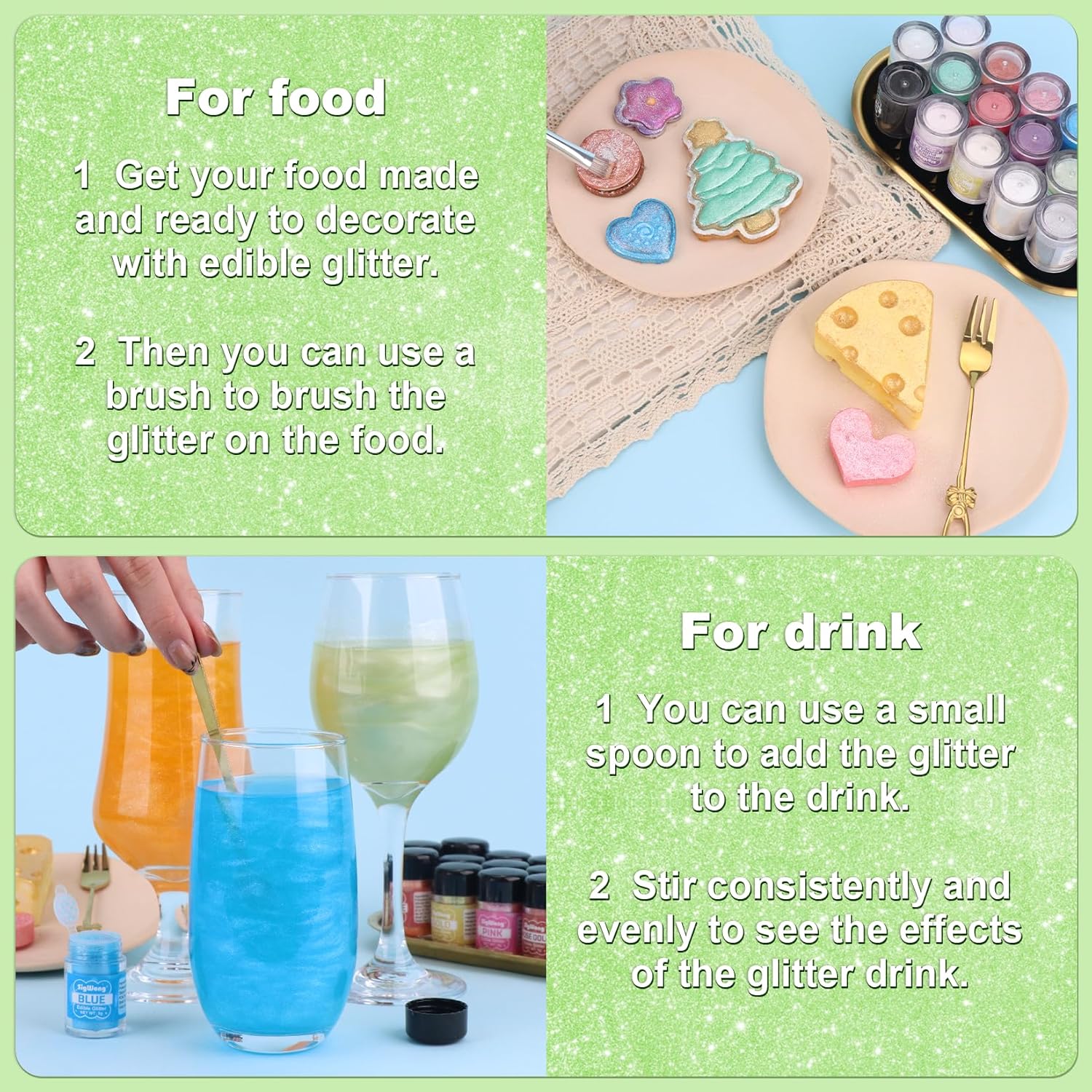 - 【Edible Glitter】: We offer edible glitter in a variety of colors, so you can match them to your party theme or personal preference to add a gorgeous shine to your drinks or baking!