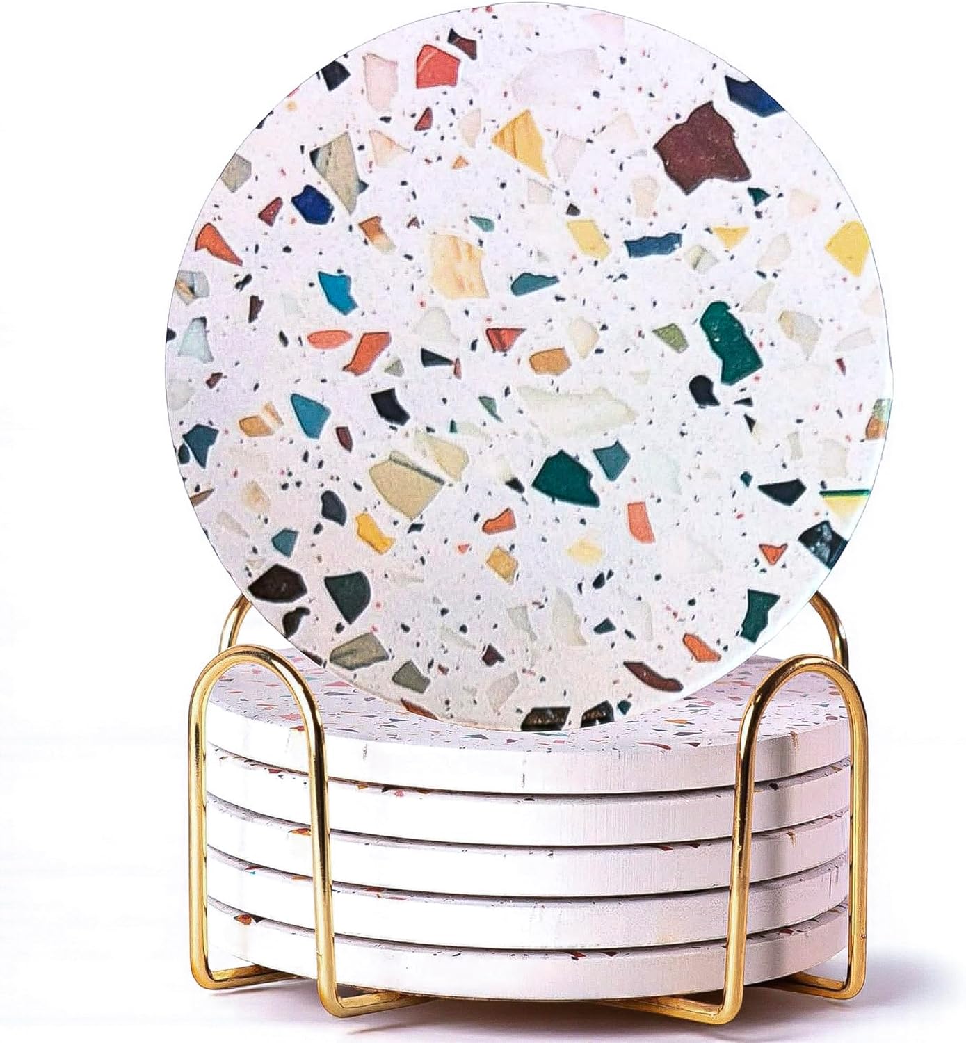Terrazzo Drink Absorbent Coasters with Holder Set of 6, Ceramic Coaster for Drinks, Coffee Table Decor, Water Absorbing Stone Coaster for Drinks (Mosaic)