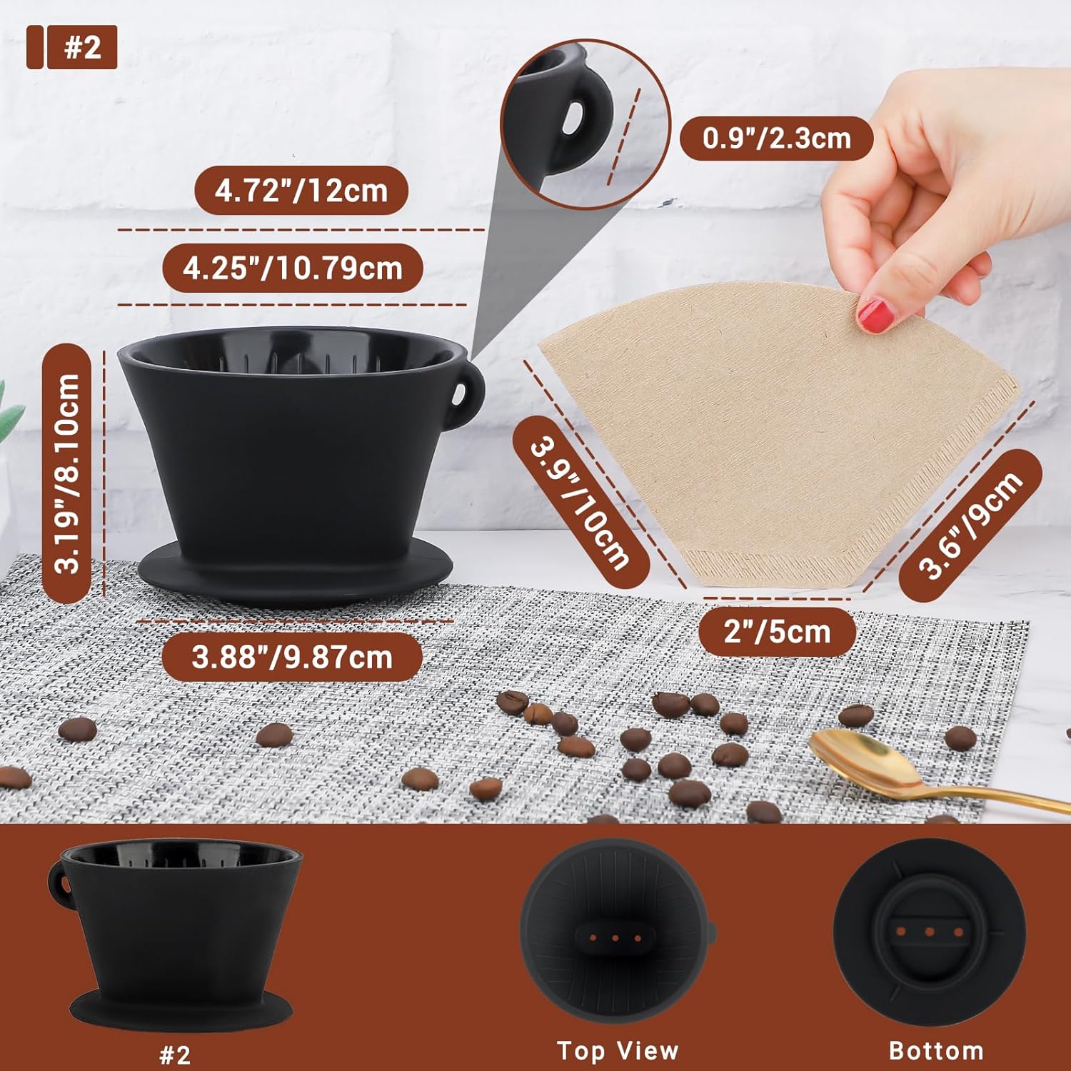 - 【Coffee Maker Set with Filter Papers】 Segarty coffee pour over set includes 1 cup #2 silicone dripper and 200pcs #2 disposable cone coffee filters, providing a complete and convenient brewing solution. The coffee dripping cup is about 300ml/10oz; Mouth diameter: 4.2”/10.7cm; Flat base diameter: 3.8''/9.8cm; Height: 3.1”/8cm. Fits most coffee mug.